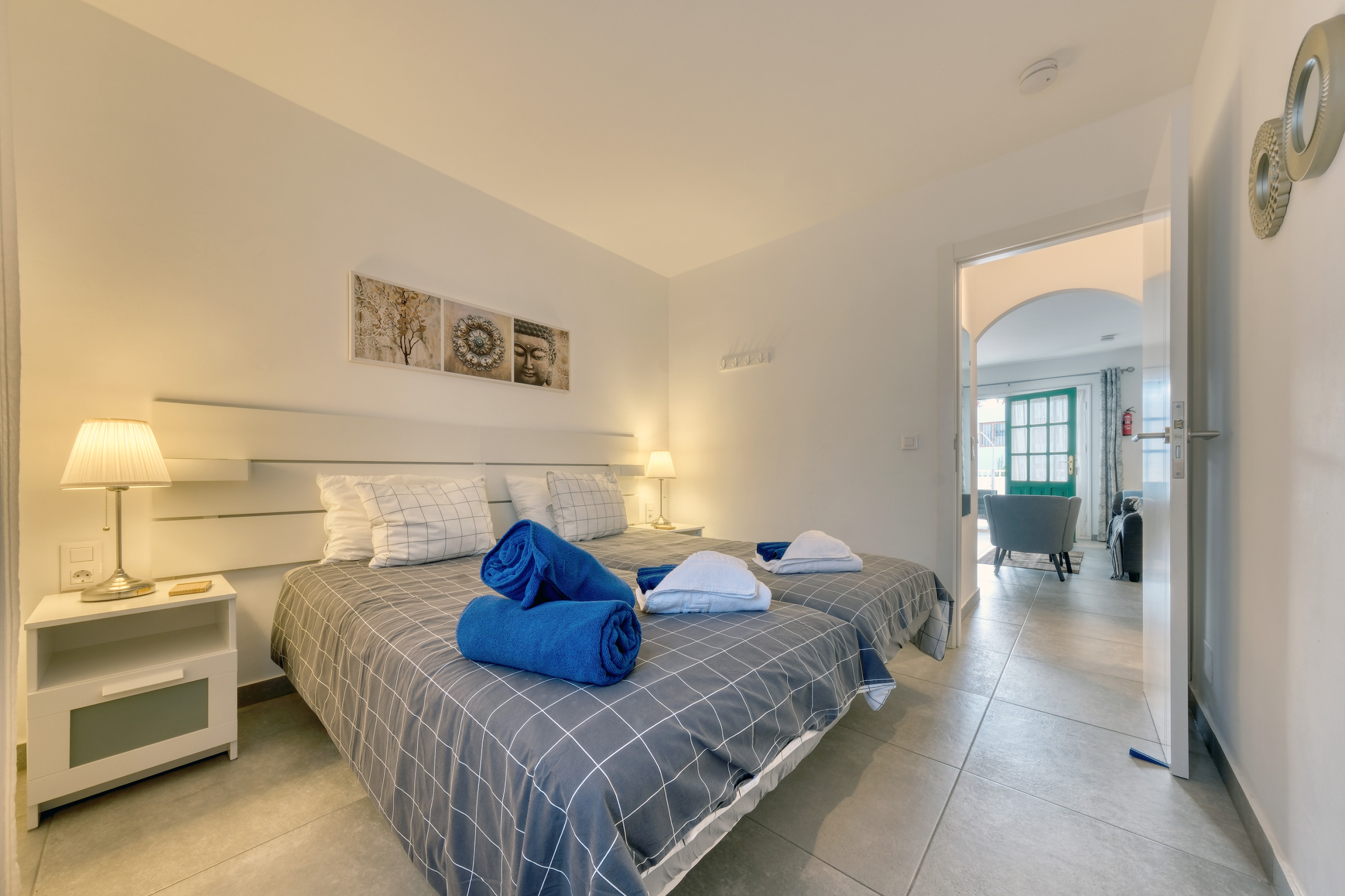 El alojamiento cuenta con un dormitorio amplio con dos camas individuales juntas, un armario empotrado y una decoración en tonos azules que transmite frescura y serenidad.
