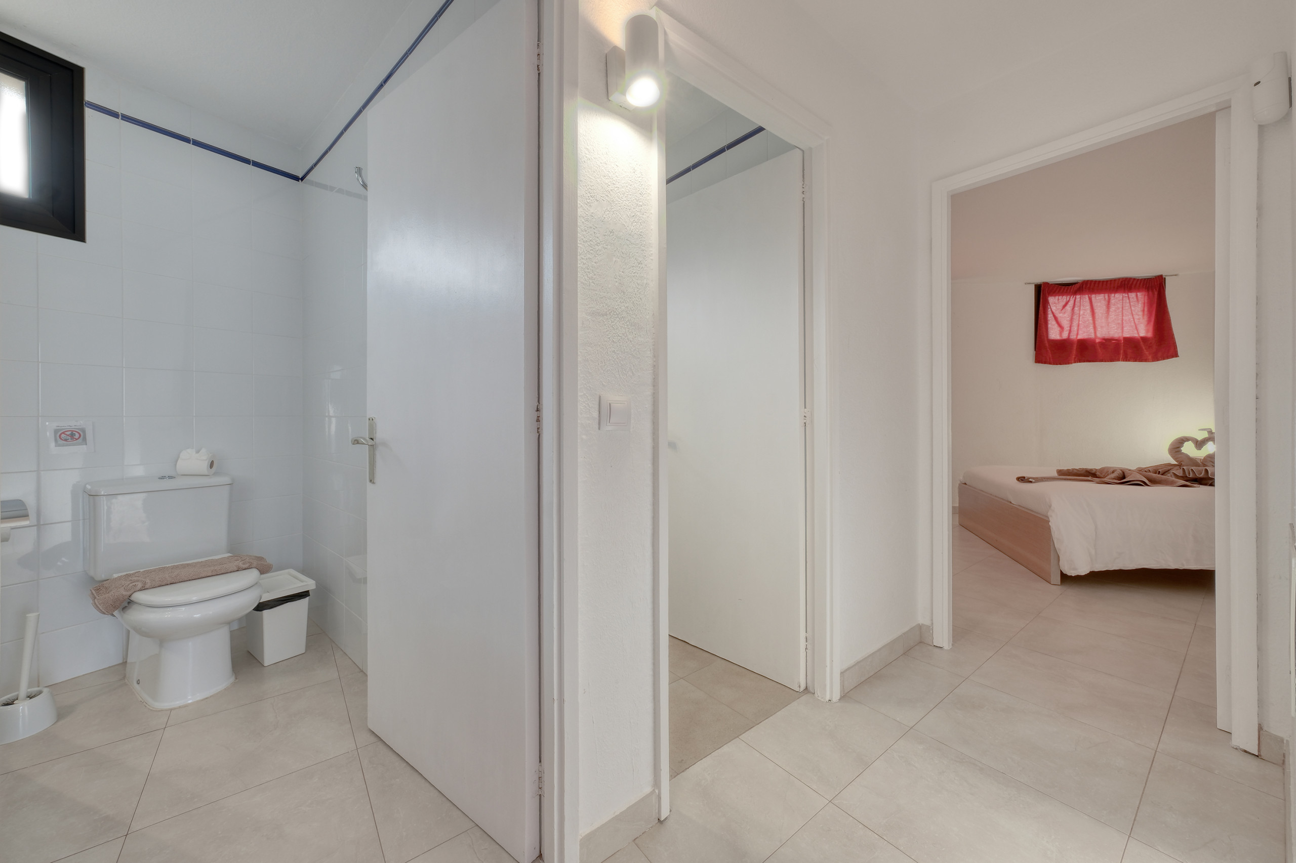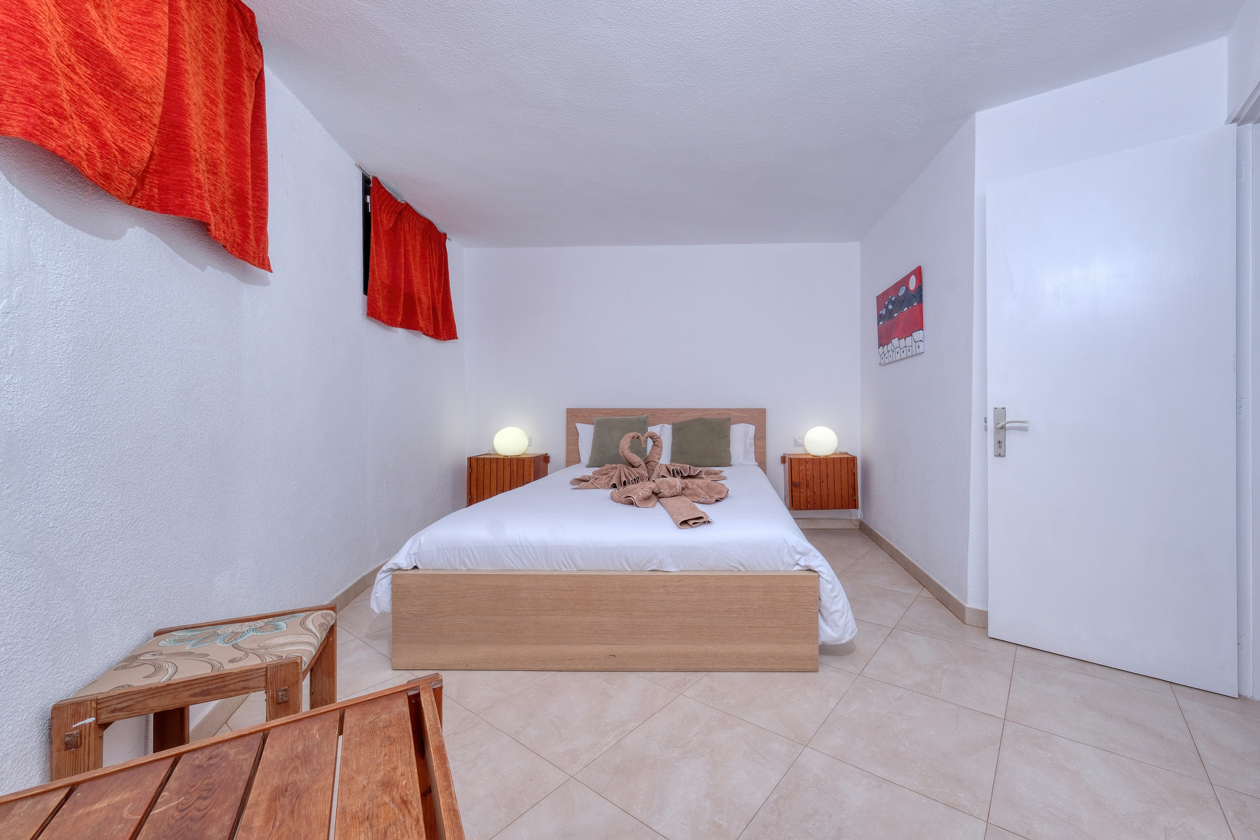 El apartamento dispone de dos dormitorios: uno con cama de matrimonio y otro con dos camas individuales, ambos con amplios armarios, lo que lo hace muy cómodo para estancias largas o viajes en familia. Cuenta con un baño completo con bañera, lavabo, WC y bidet. La ropa de cama y las toallas están incluidas, y en estancias superiores a 10 noches se realiza cambio de sábanas y toallas para mayor comodidad.