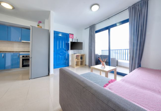 El salón es luminoso y acogedor, con sofá, Smart TV y acceso directo a una terraza privada con vistas parciales al océano, perfecta para disfrutar de un desayuno al aire libre o una copa al atardecer. En todo el apartamento hay conexión a wifi con fibra óptica, ideal si necesitas teletrabajar o simplemente mantenerte conectado.