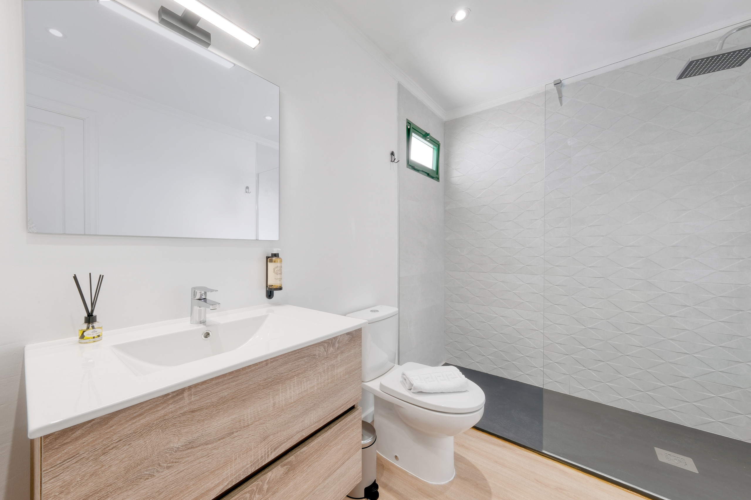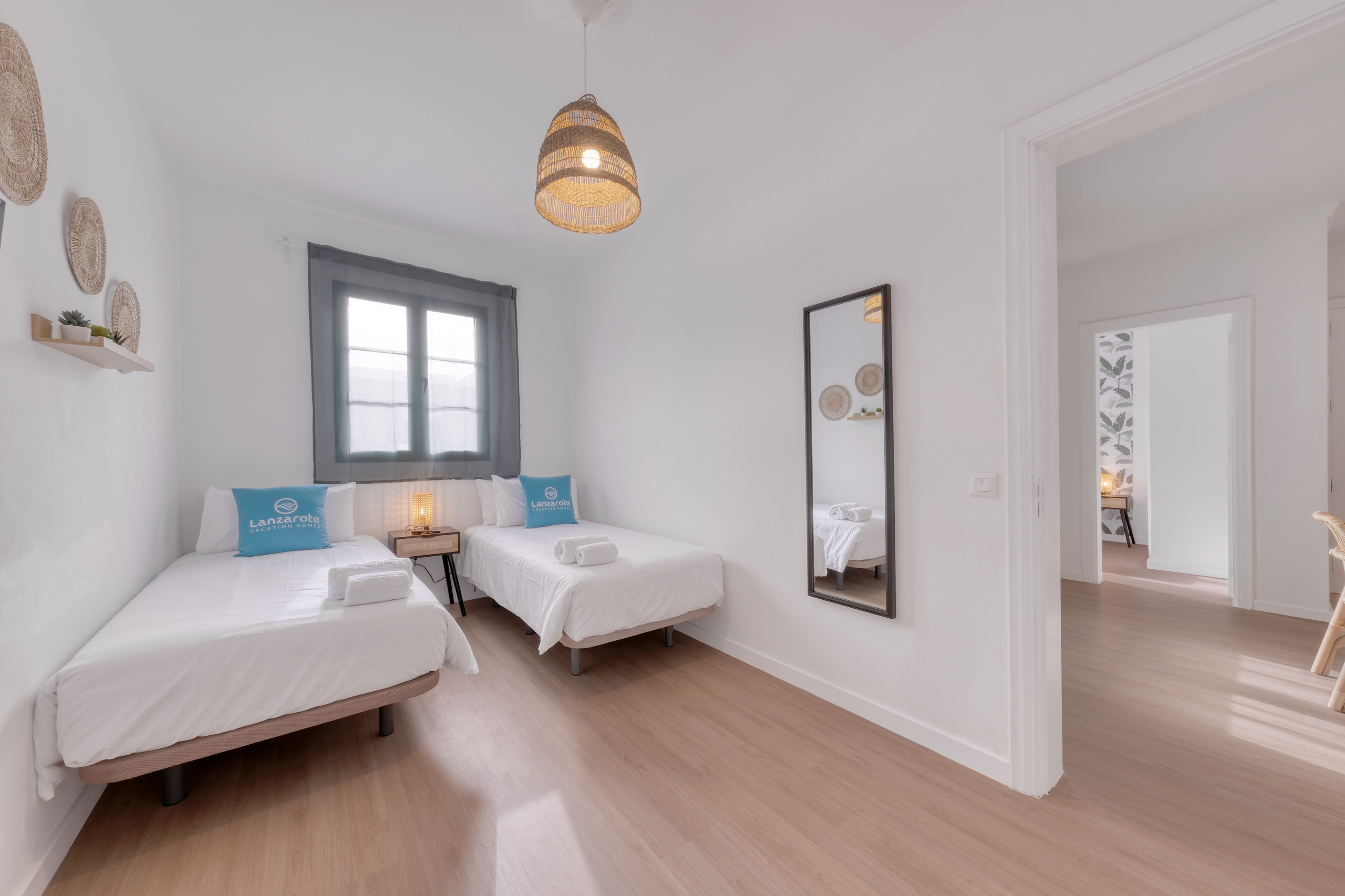 La casa cuenta con dos elegantes dormitorios con camas de matrimonio de ensueño y un tercer dormitorio con dos camas individuales ideales para niños o amigos. Cada espacio ha sido cuidadosamente diseñado para combinar confort, estilo y luminosidad, creando un ambiente cálido y sofisticado.