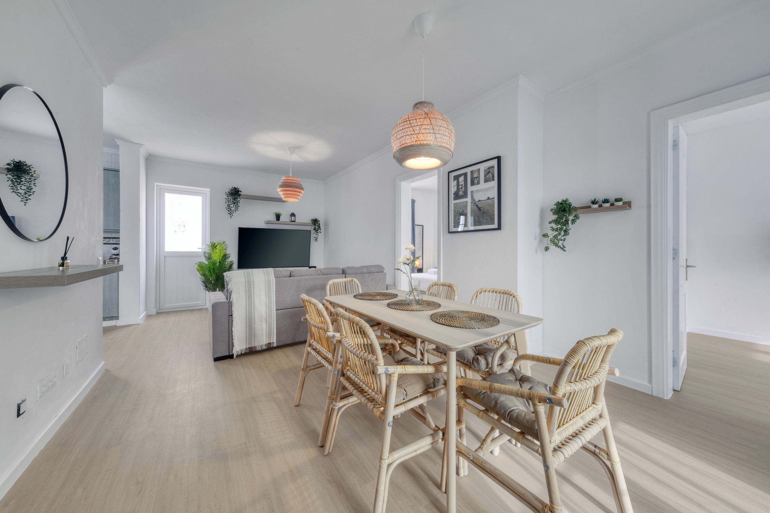 Salón: sofá de 4 plazas, mesa con sillas y Smart tv de 55' con canales internacionales satélite.