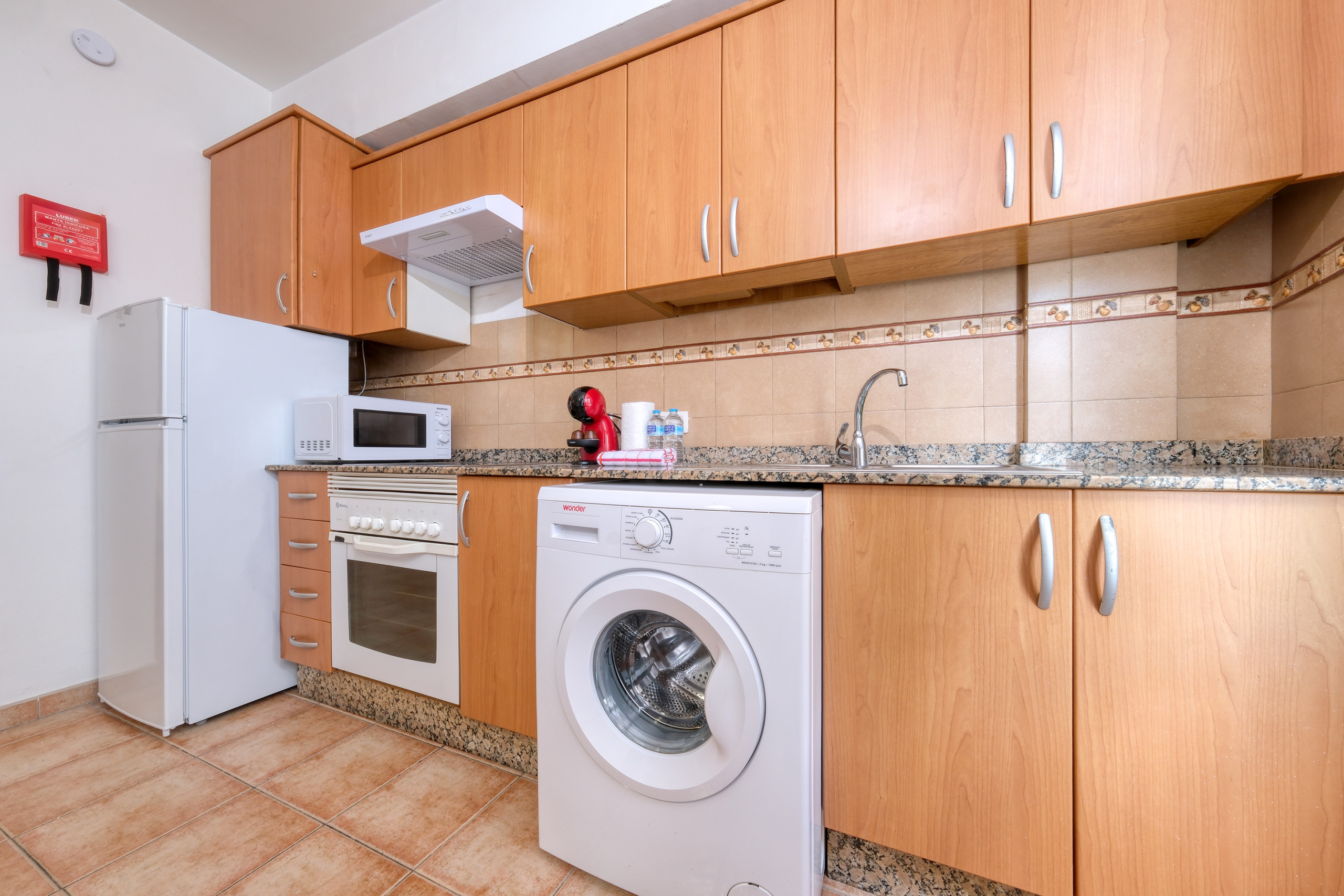La cocina está totalmente equipada: horno, microondas, placa vitrocerámica, cafetera de cápsulas Nescafé, tostadora, hervidor de agua y completo menaje.