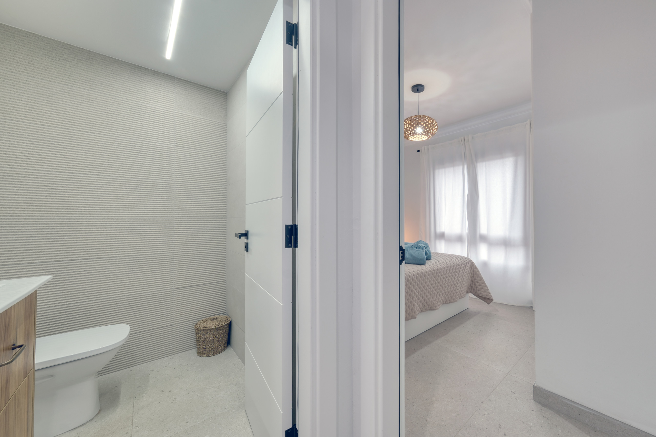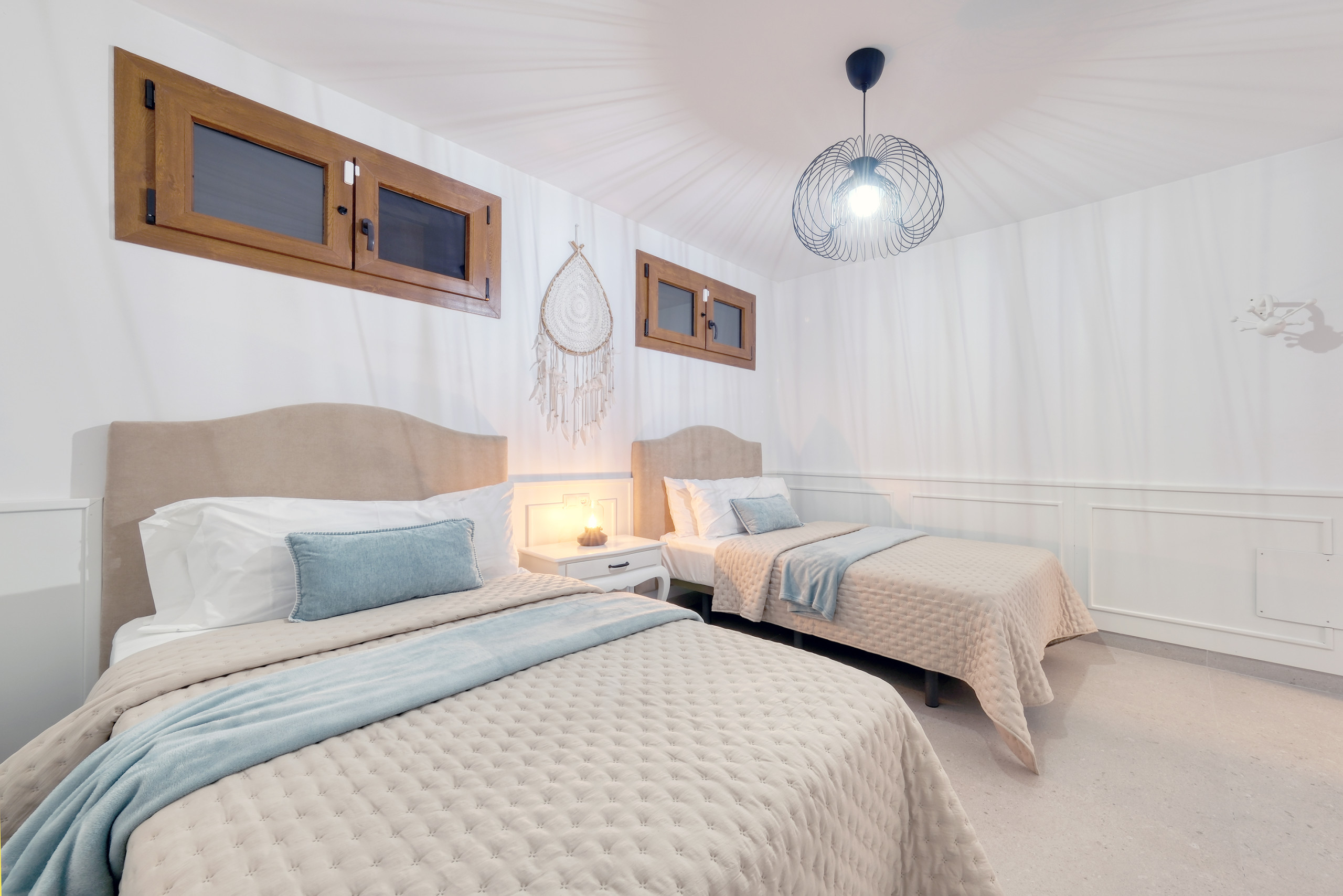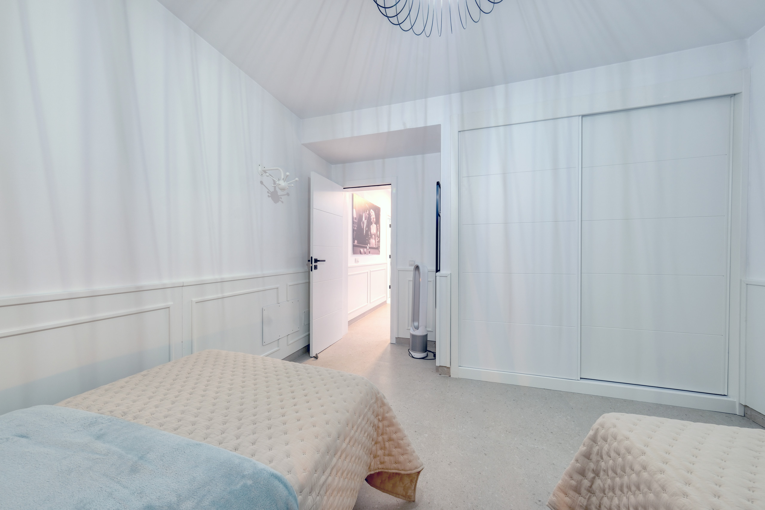 Al entrar, te recibirá un ambiente luminoso y espacioso que invita al relax. La villa cuenta con dos dormitorios dobles con baño en suite, perfectos para mantener la intimidad, y un tercer dormitorio con camas individuales, ideal para niños o amigos. Un tercer baño completo con ducha, bañera y bidé ofrece comodidad extra para todos los huéspedes. Sábanas, toallas de baño y de playa están incluidas para que solo tengas que preocuparte de disfrutar.