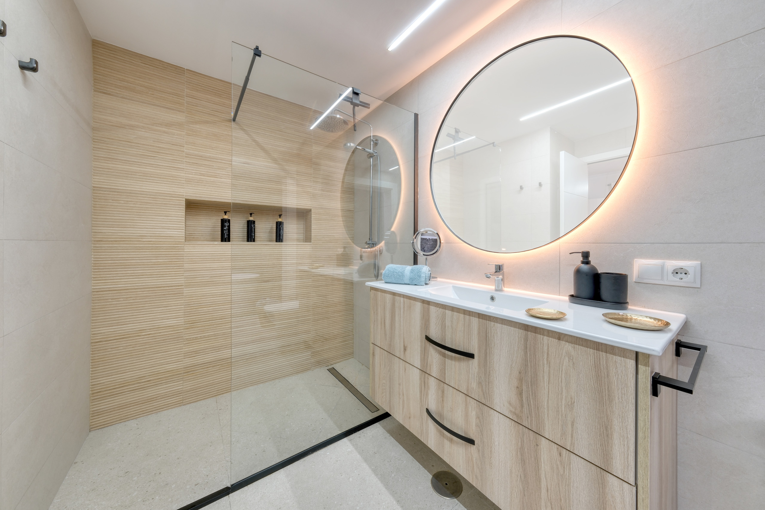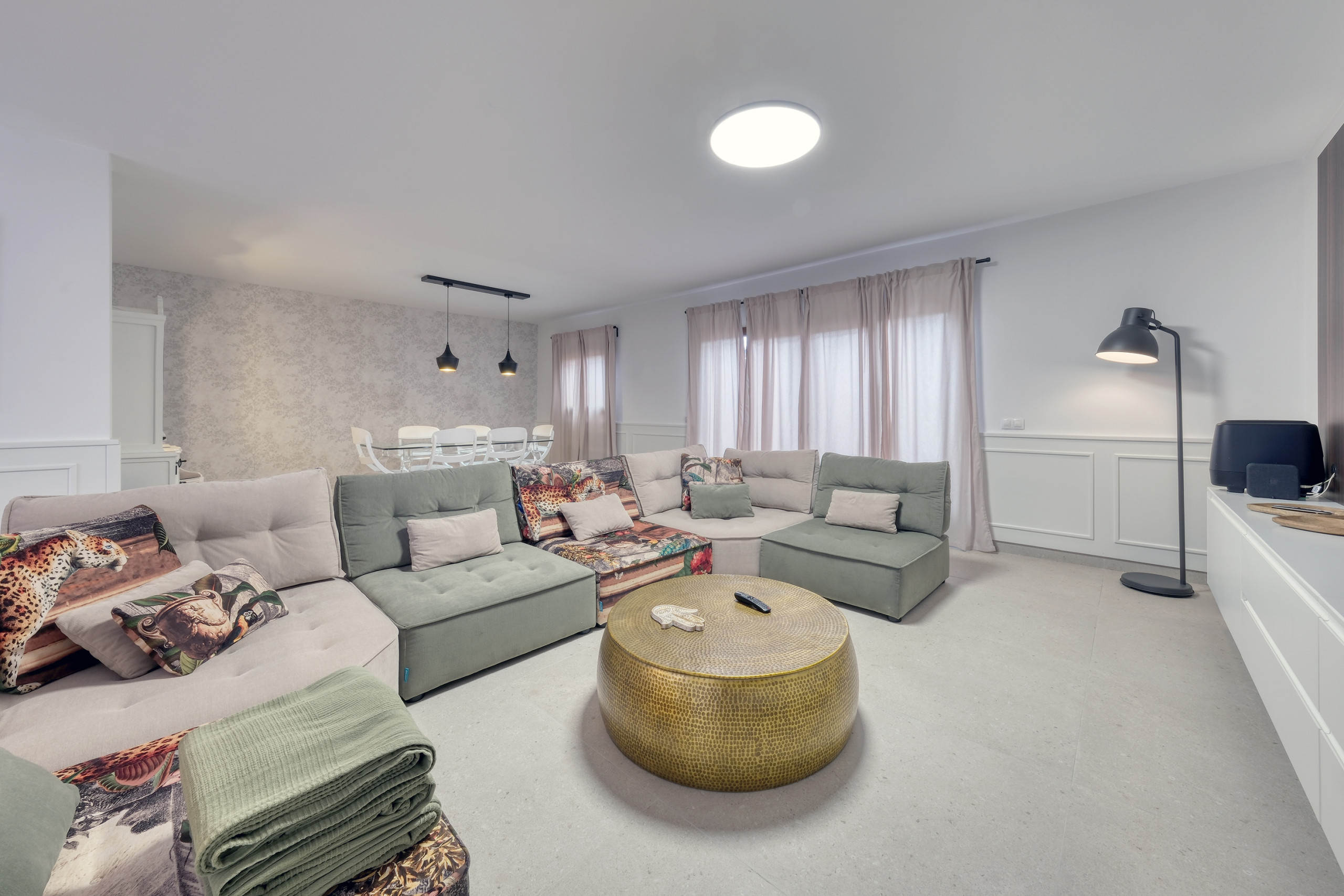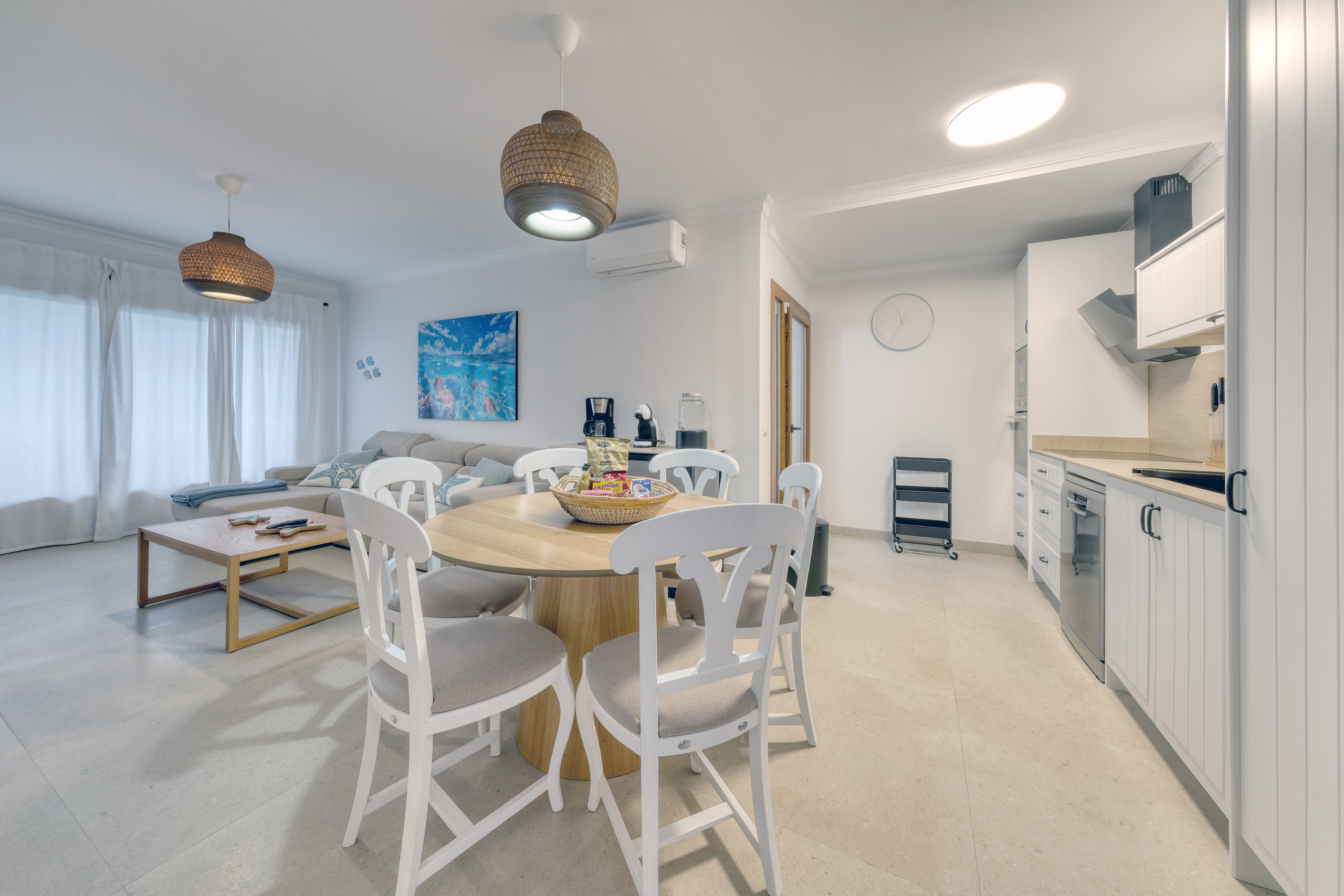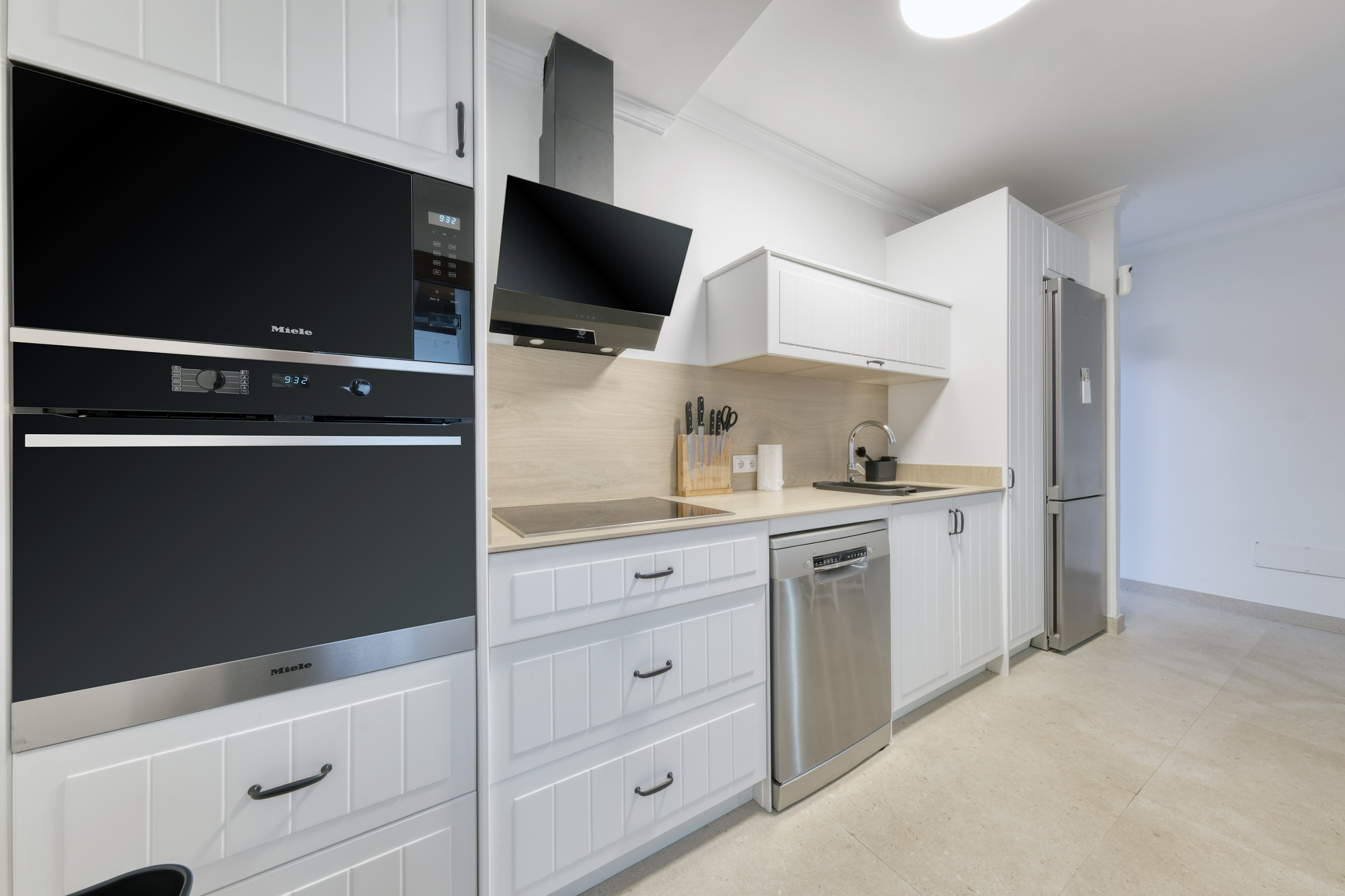 La planta superior alberga un elegante y luminoso salón con televisión de pantalla plana y canales internacionales, que se abre a una amplia terraza con vistas al océano. La cocina americana, de diseño moderno y concepto abierto, está totalmente equipada con electrodomésticos de alta calidad: lavavajillas, horno, microondas, nevera, cafetera, tostadora, hervidor de agua y completo menaje, ofreciendo todo lo necesario para una estancia cómoda y sofisticada.
