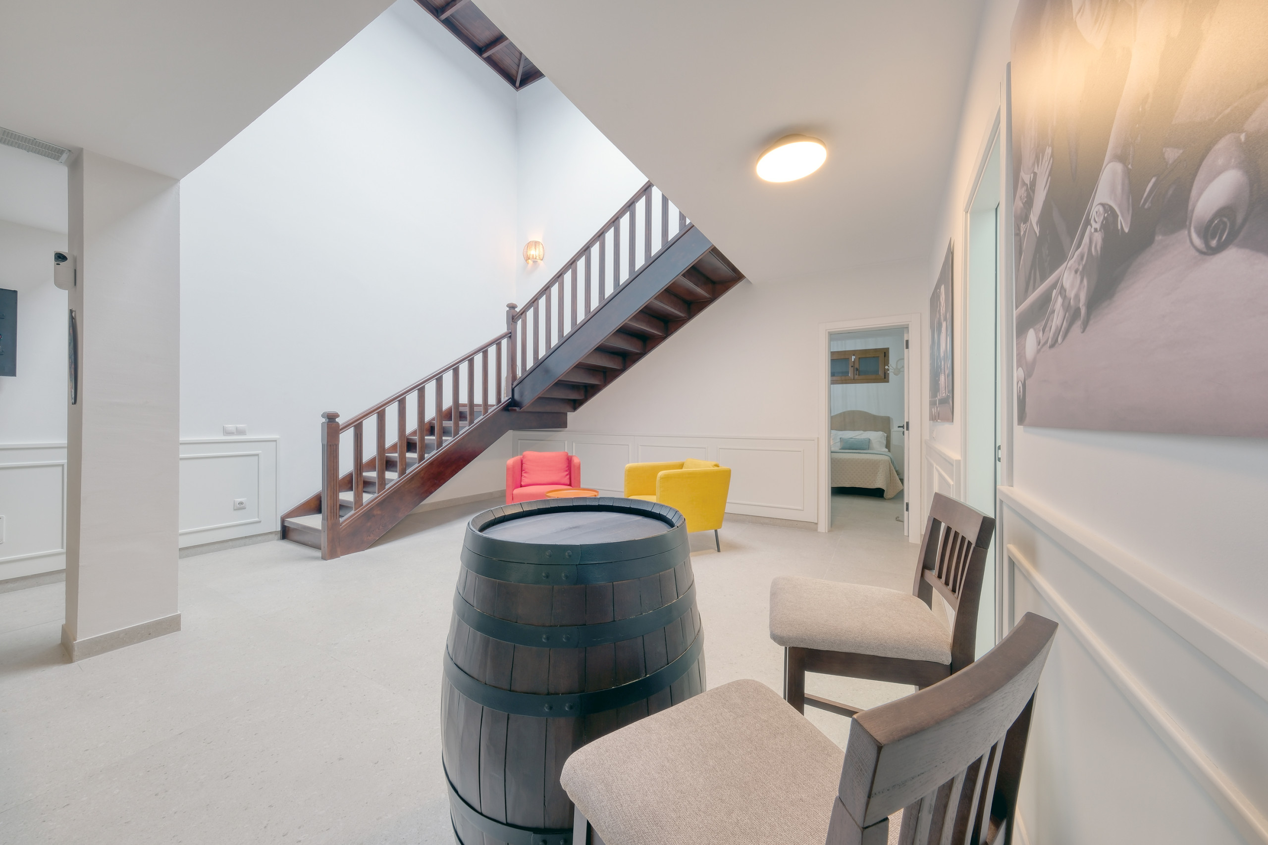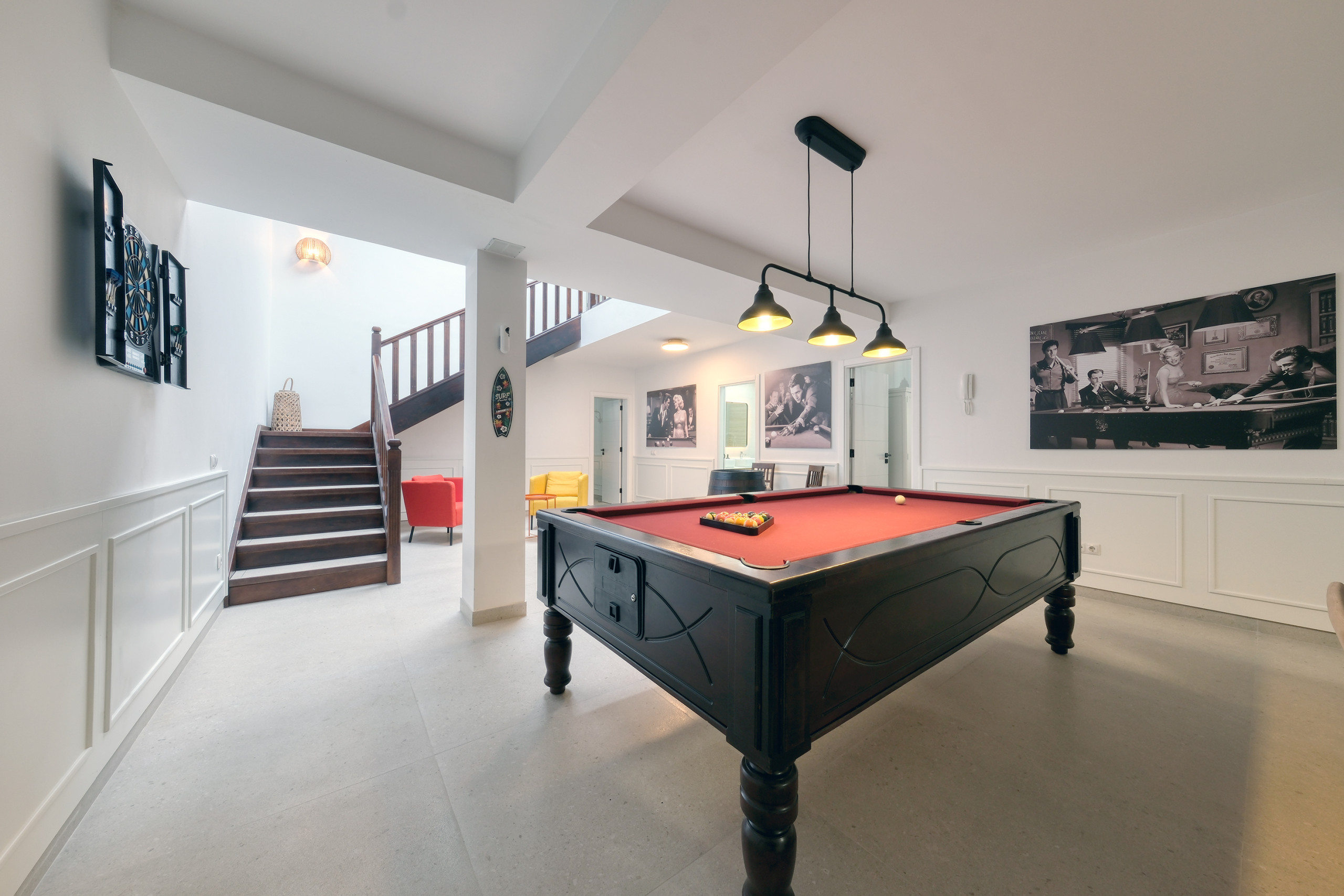 La planta inferior está pensada para el ocio y el descanso. Dispone de un segundo salón con mesa de billar, un amplio sofá y televisión de pantalla plana con canales internacionales. Aquí se ubican también dos dormitorios con dos camas individuales cada uno, uno de ellos con acceso directo a una terraza privada, además de un baño adicional con plato de ducha.