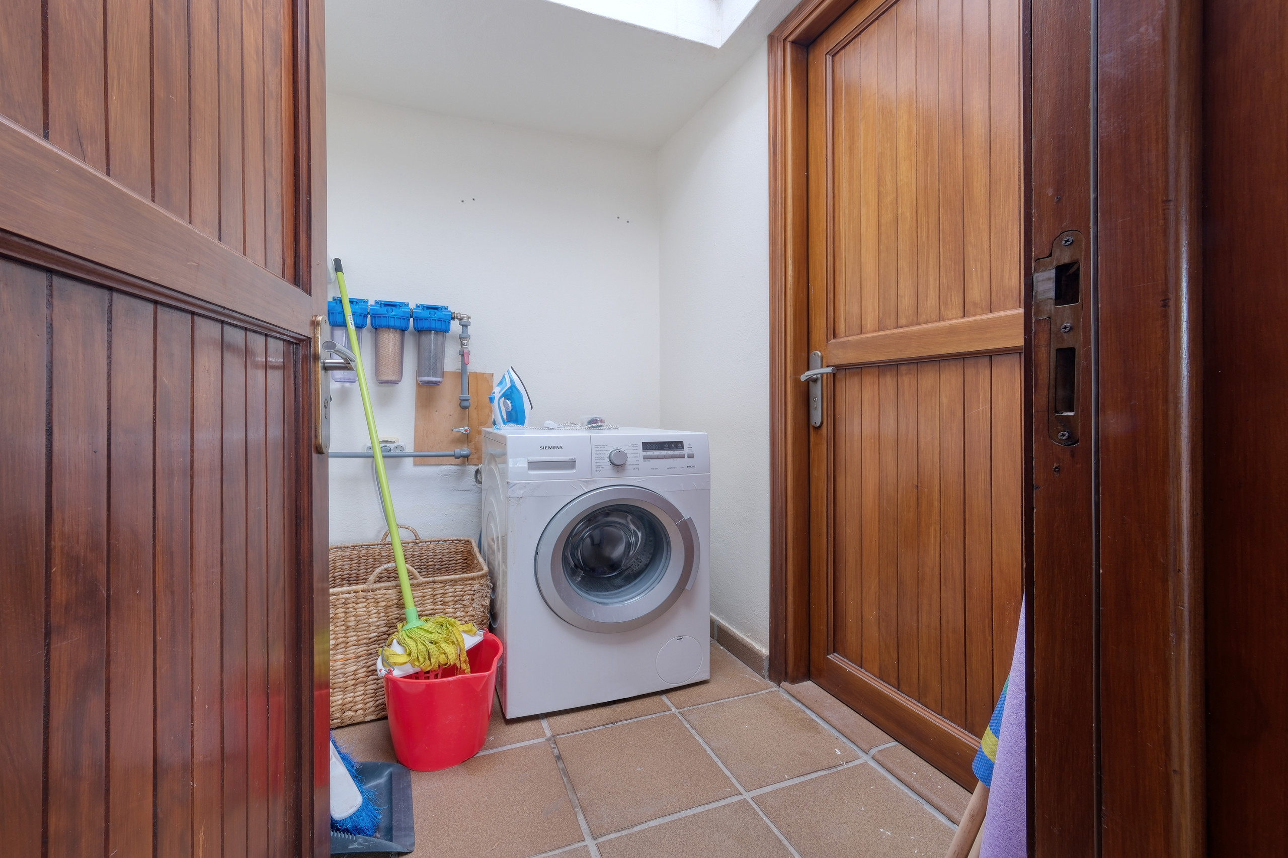 La villa dispone de dos acogedores dormitorios con camas de matrimonio y armarios empotrados. El dormitorio principal cuenta con baño privado en suite y acceso directo a una agradable terraza privada, perfecta para disfrutar de momentos de tranquilidad al aire libre. El segundo dormitorio se encuentra junto a un baño completo independiente con plato de ducha y secador de pelo.