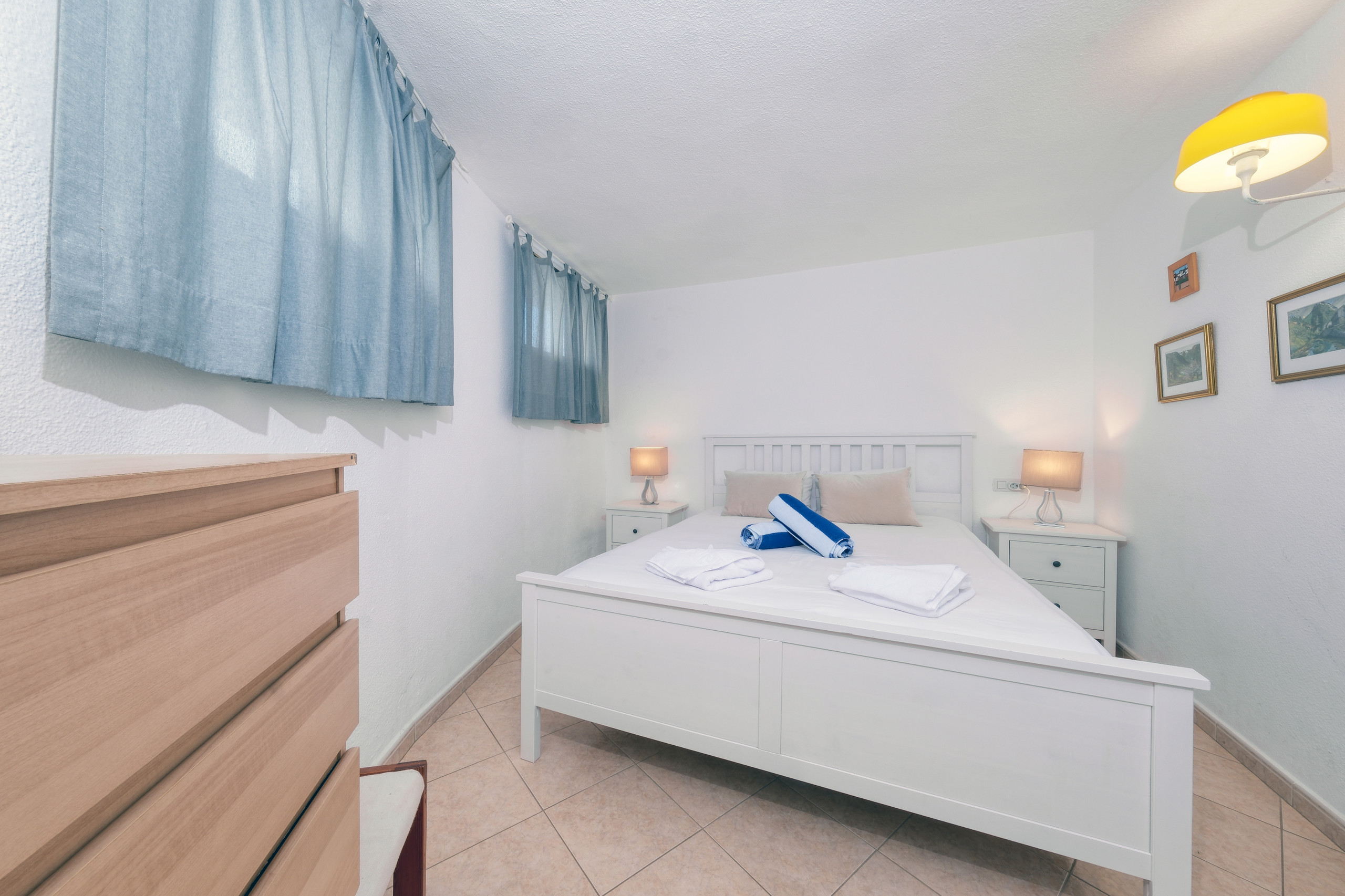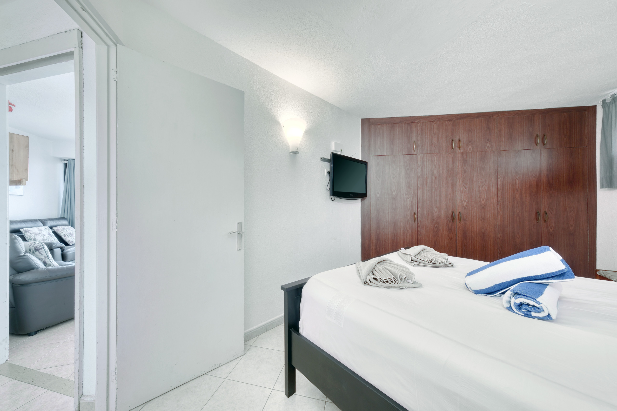 Die Wohnung verfügt über zwei Schlafzimmer: eines mit einem Doppelbett und ein anderes mit zwei Einzelbetten, beide mit geräumigen Schränken, was sie sehr komfortabel für lange Aufenthalte oder Familienreisen macht. Sie verfügt über ein vollständiges Badezimmer mit Badewanne, Waschbecken, WC und Bidet. Bettwäsche und Handtücher sind inbegriffen, und bei Aufenthalten von mehr als 10 Nächten erfolgt ein Wechsel von Bettwäsche und Handtüchern für mehr Komfort.