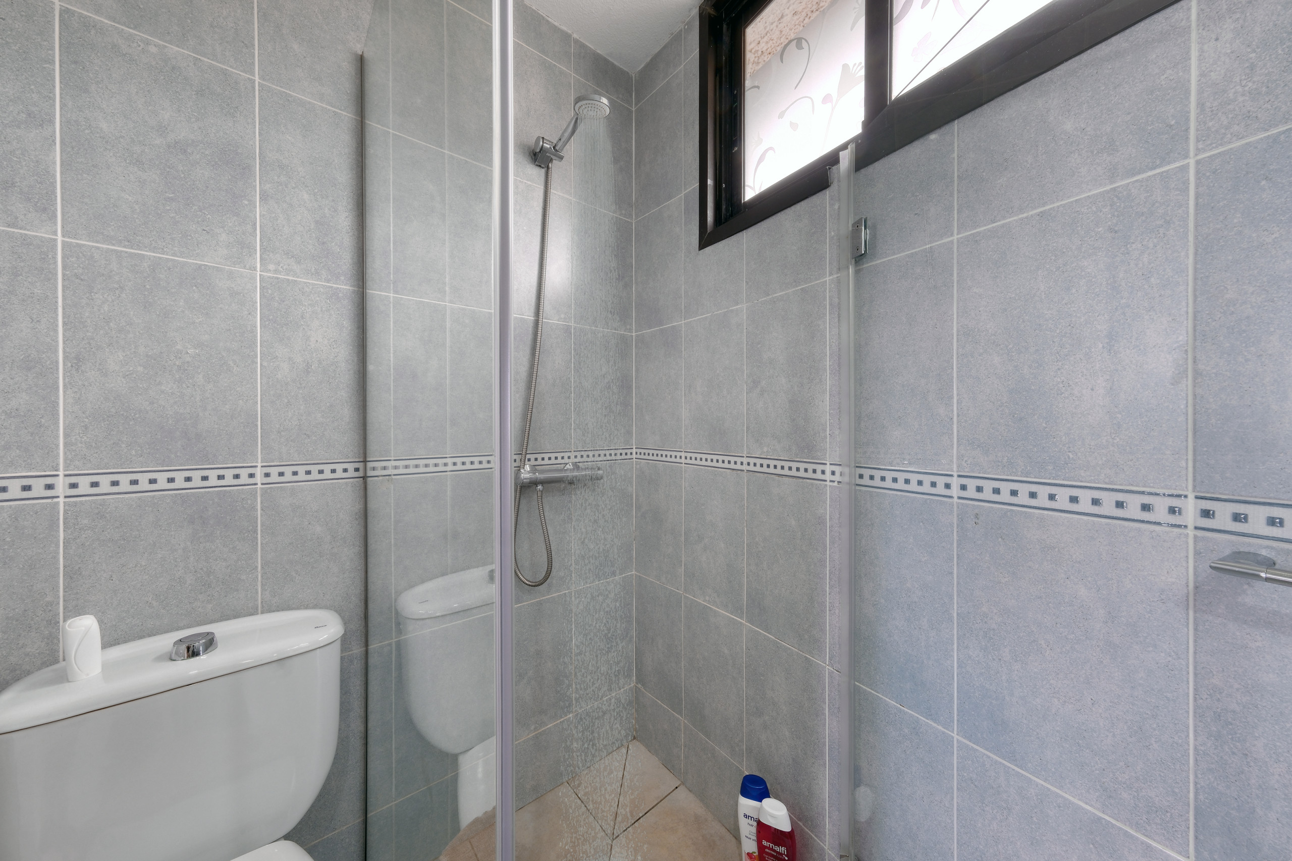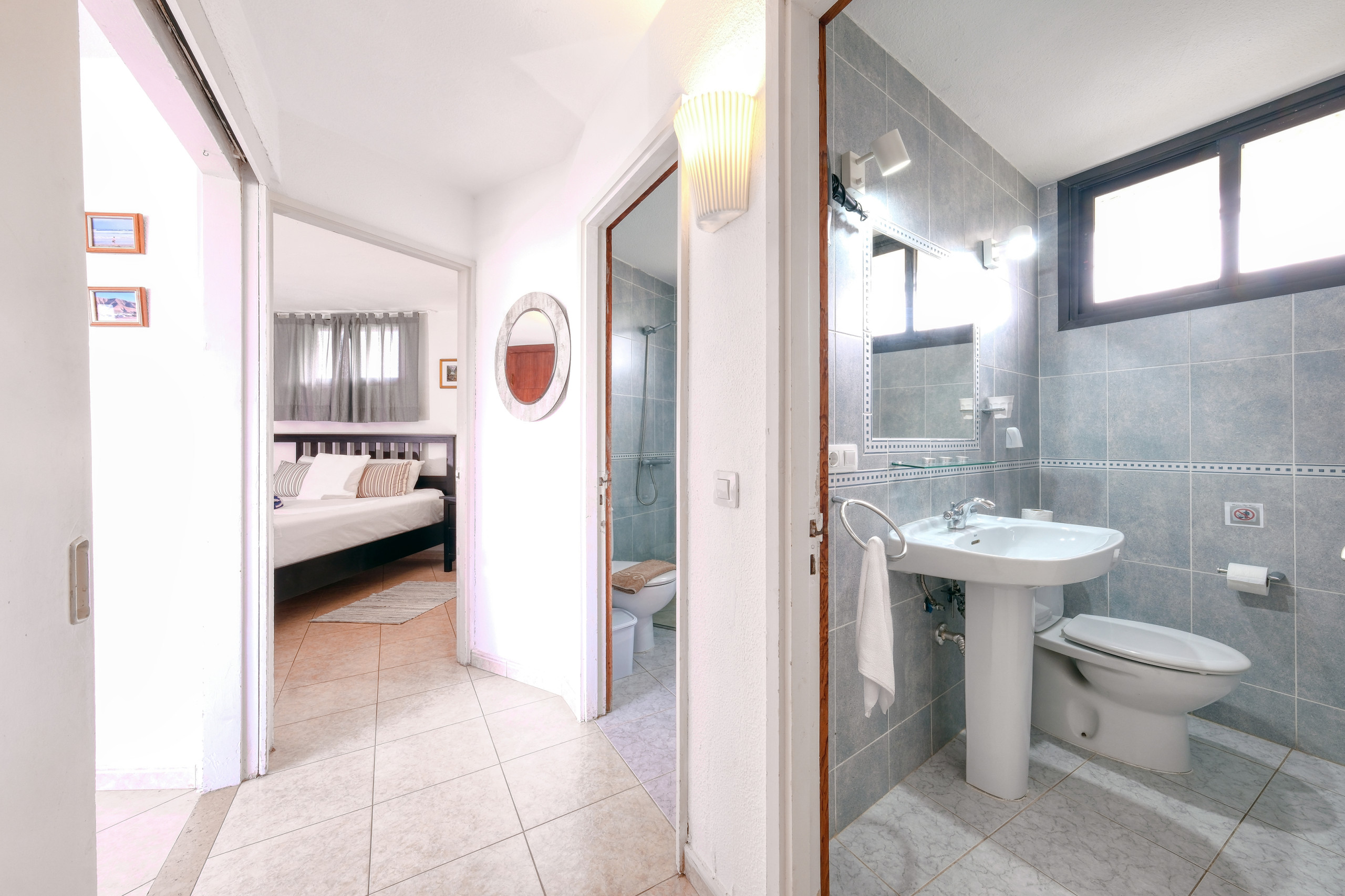 Das Badezimmer ist in zwei unabhängige Bereiche unterteilt, was während des Aufenthalts mehr Komfort bietet. Ein Bereich verfügt über eine Dusche, Waschbecken und WC, während der zweite WC und ein zusätzliches Waschbecken umfasst, was eine gleichzeitige Nutzung ermöglicht und mehr Funktionalität für Familien oder Gruppen bietet.