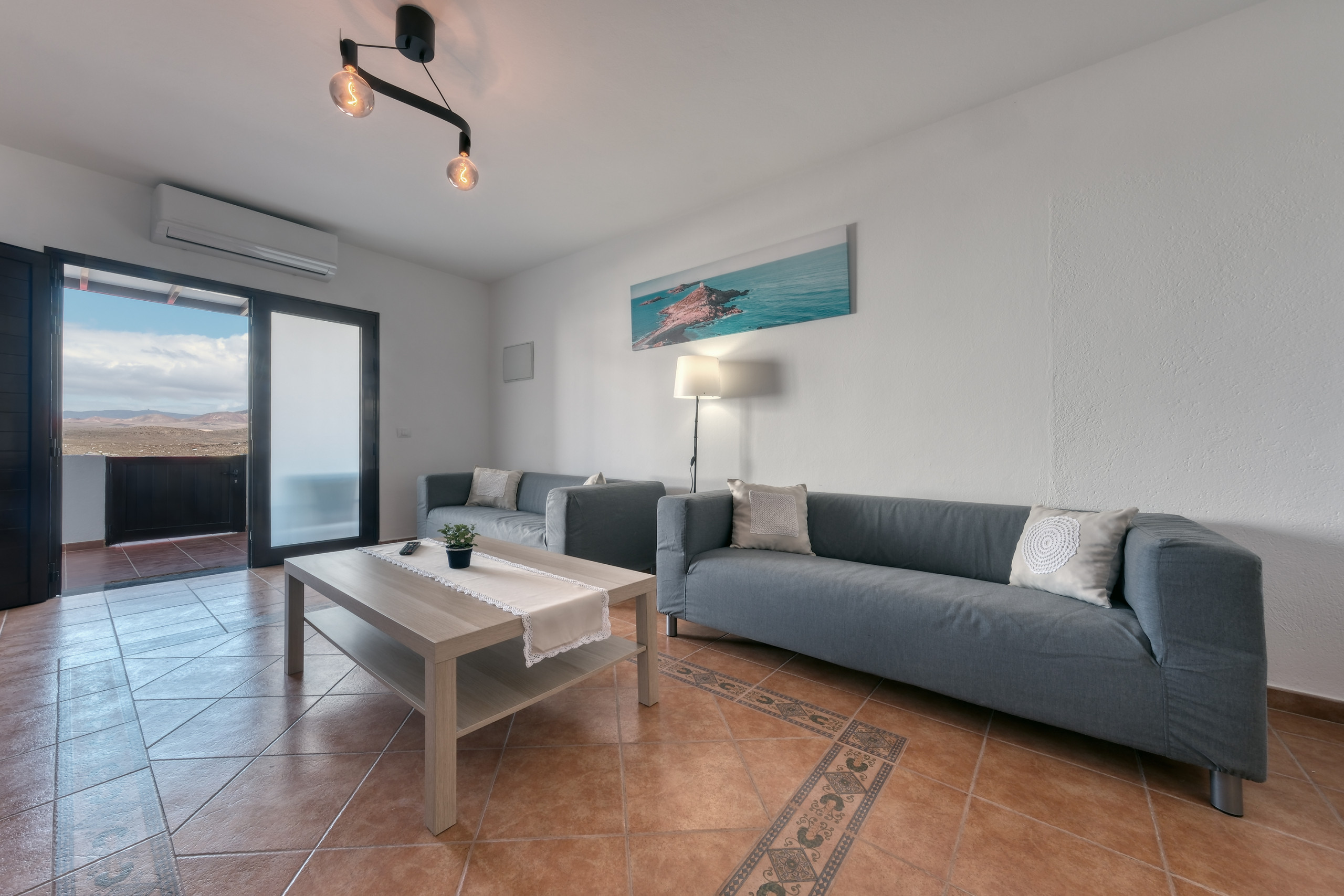 Beim Betreten der Wohnung finden wir ein gemütliches Wohnzimmer, das mit einem bequemen Sofa, Fernseher und kostenlosem WLAN ausgestattet ist und so einen perfekten Raum zum Ausruhen und Genießen von Freizeitmomente nach einem Tag voller Abenteuer auf der Insel schafft.
