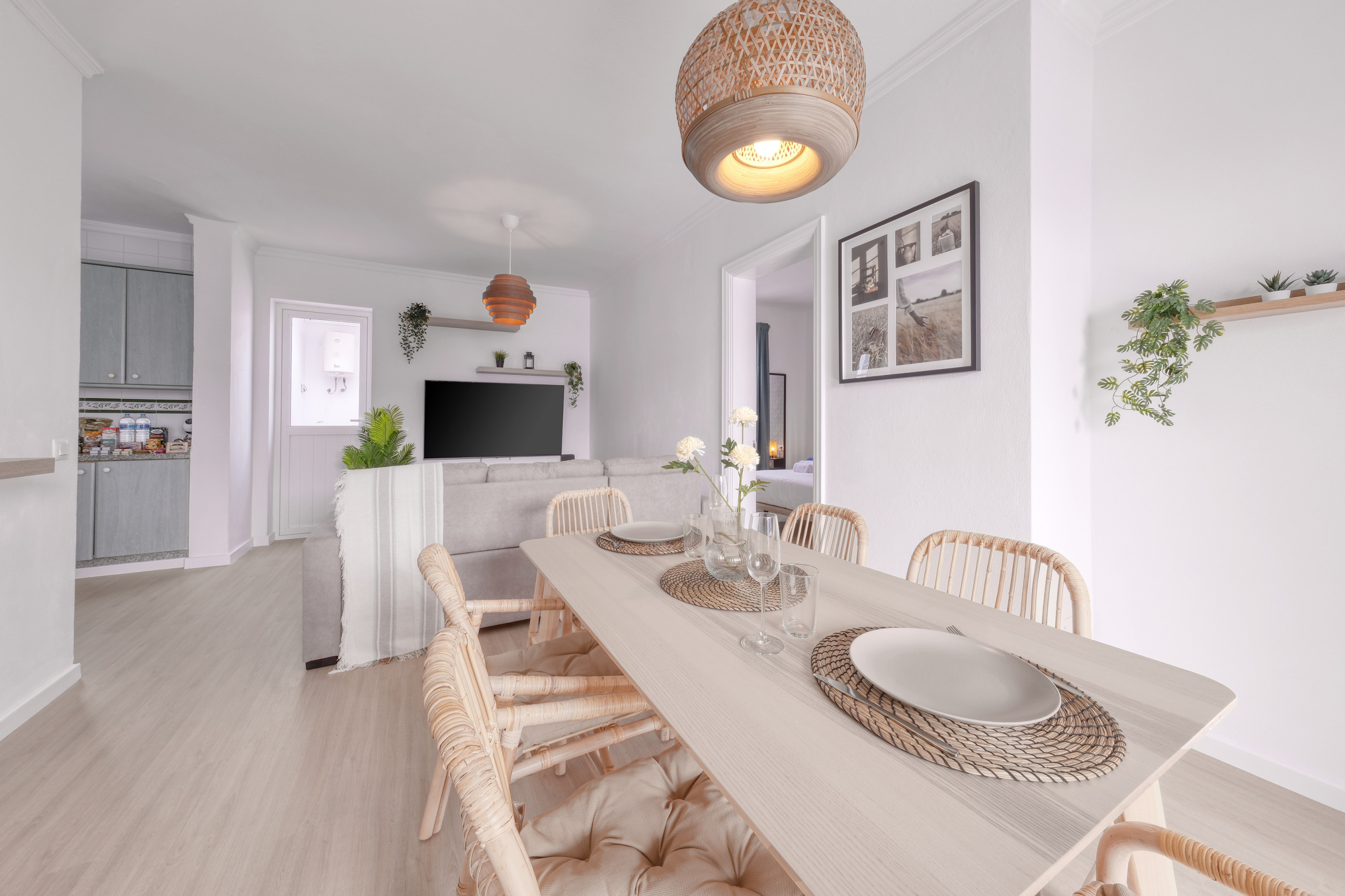 Wohnzimmer: 4-Sitzer-Sofa, Tisch mit Stühlen und 55' Smartv mit internationalen Satellitenkanälen.