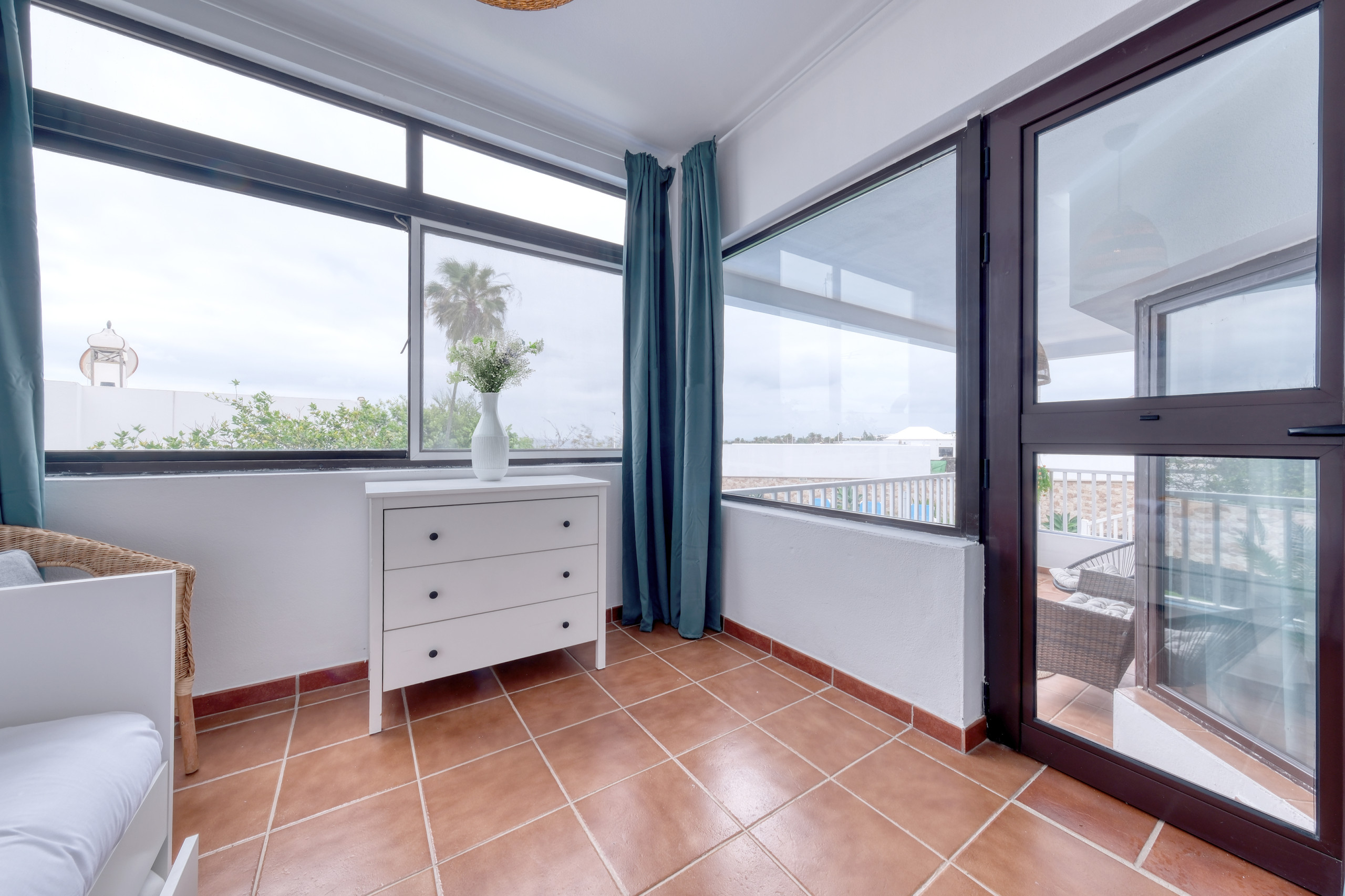 Beim Treppensteigen erreichen Sie das erste Stockwerk, wo sich das vierte und fünfte Zimmer befinden. Das vierte Zimmer ist mit einem 90-cm-Bett, Kleiderschrank, Spiegel und Fenster zur Außenseite ausgestattet. Das fünfte Zimmer bietet ein Doppelbett, Klimaanlage, Schreibtisch und ein Badezimmer en suite mit geräumiger Dusche. Dieses Zimmer hat Zugang zu einer großen Terrasse im Freien, teilweise überdacht und teilweise offen, ideal zum Sonnenbaden. Die Terrasse ist mit Sofas ausgestattet und bietet einen schönen Blick auf Playa Blanca.