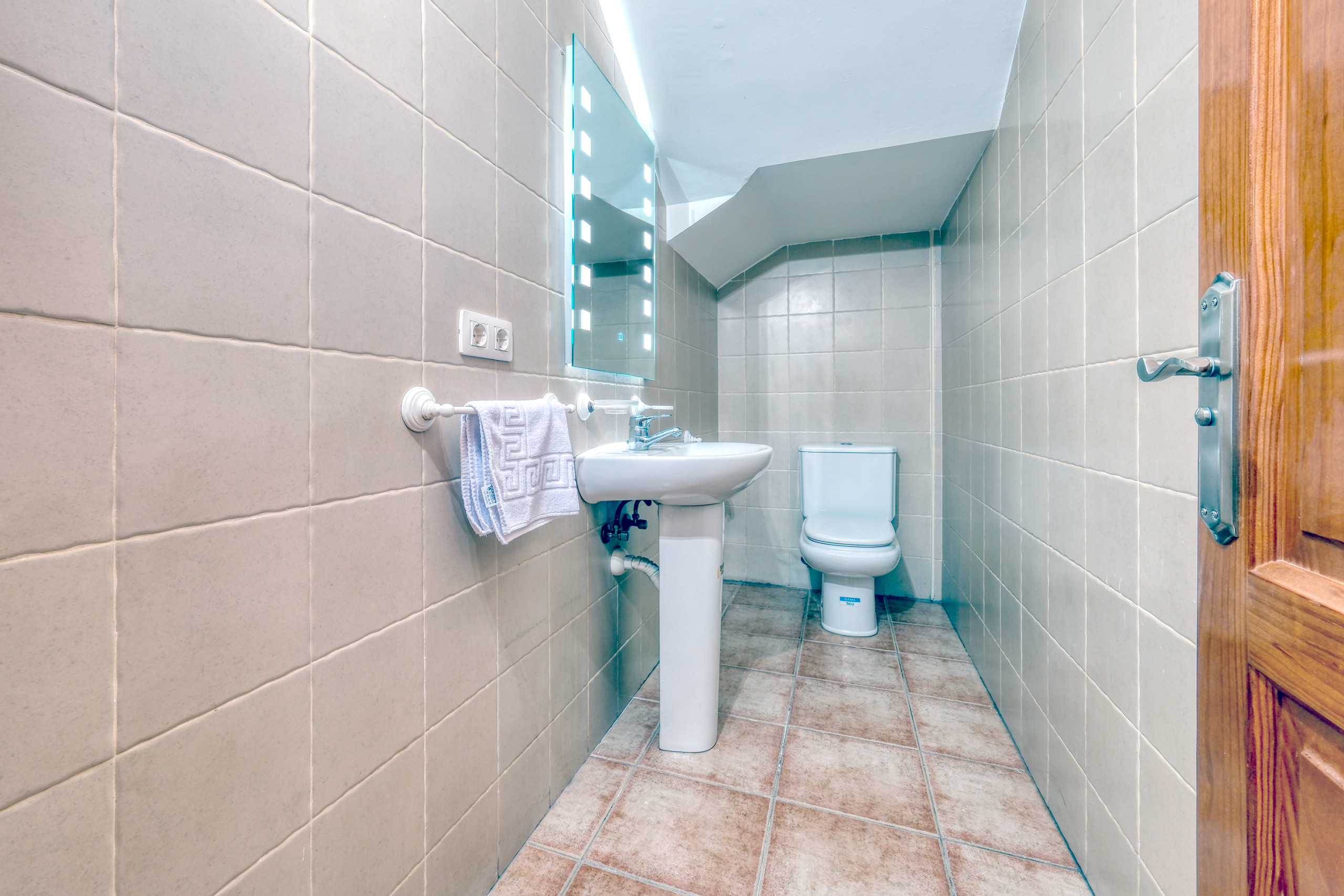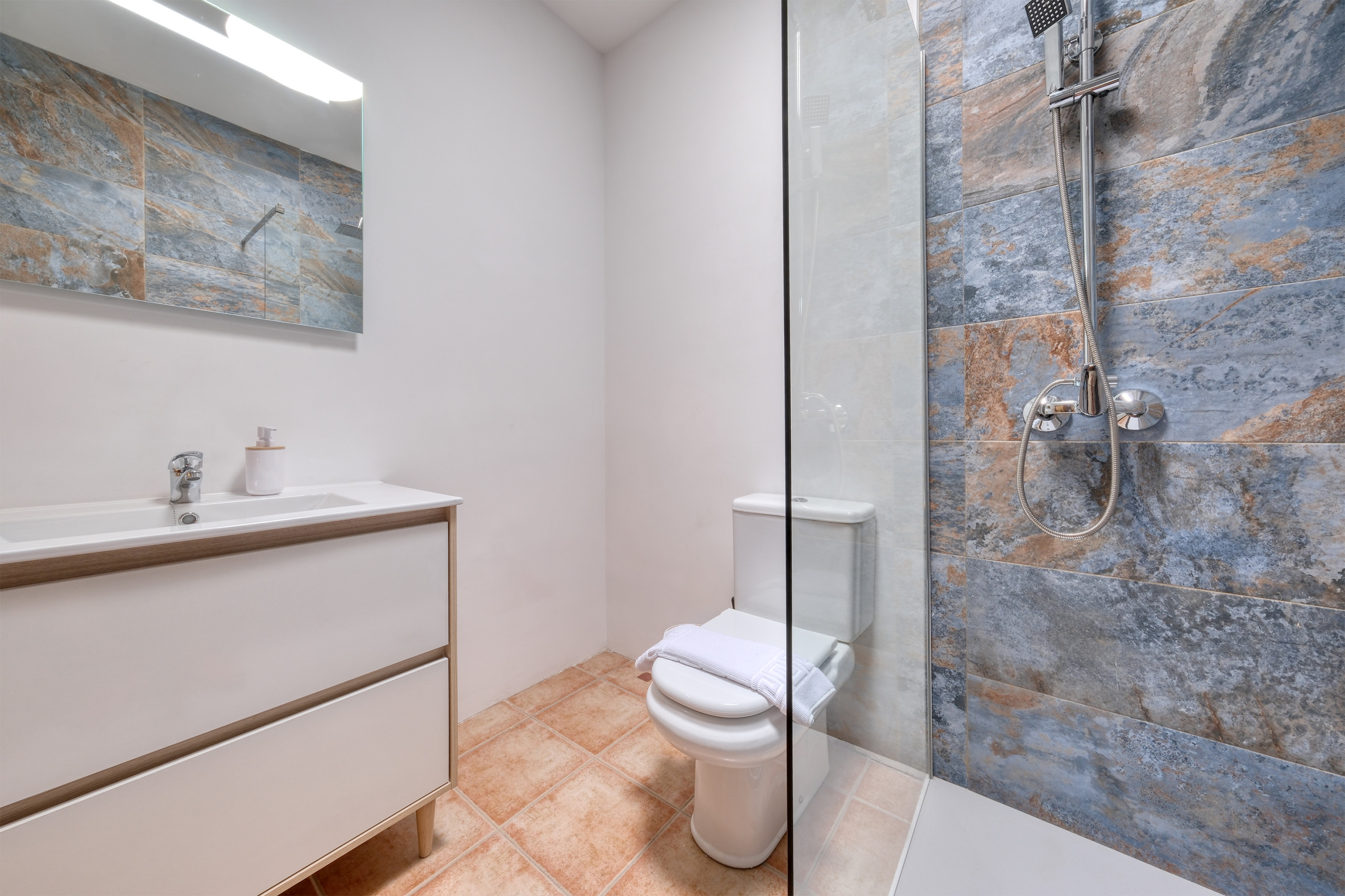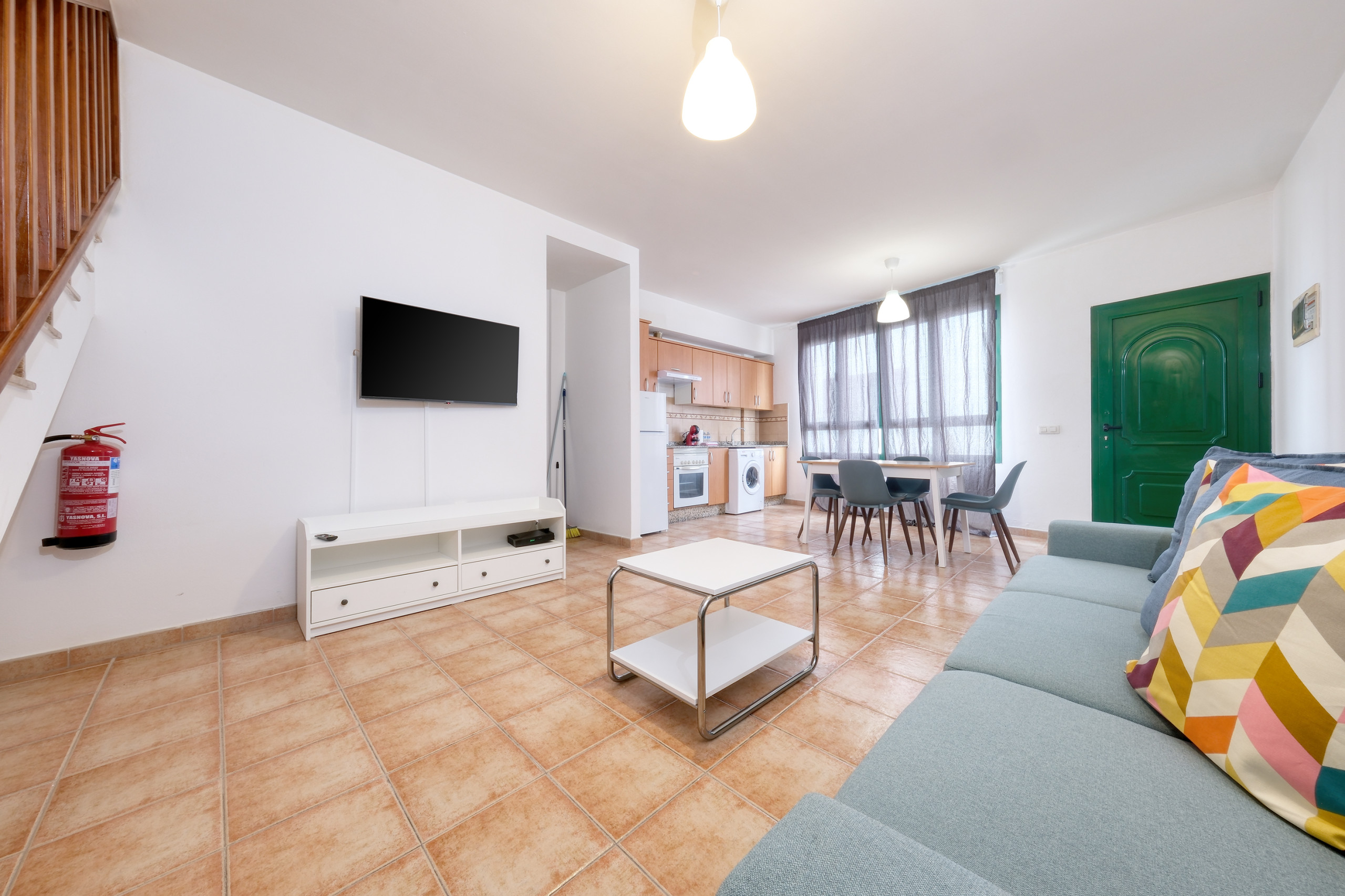 The duplex is designed to offer comfort and functionality: on the ground floor you will find the leisure area, with an open-plan kitchen equipped with everything necessary to prepare your favourite dishes —from a spacious fridge to oven, microwave, ceramic hob and complete kitchenware—. It also has a toaster, juicer and Dolce Gusto coffee machine so that each morning begins with energy. The living room, with a comfortable sofa, television and free wifi connection, becomes the ideal space to relax after exploring the island. The ground floor also has a toilet.