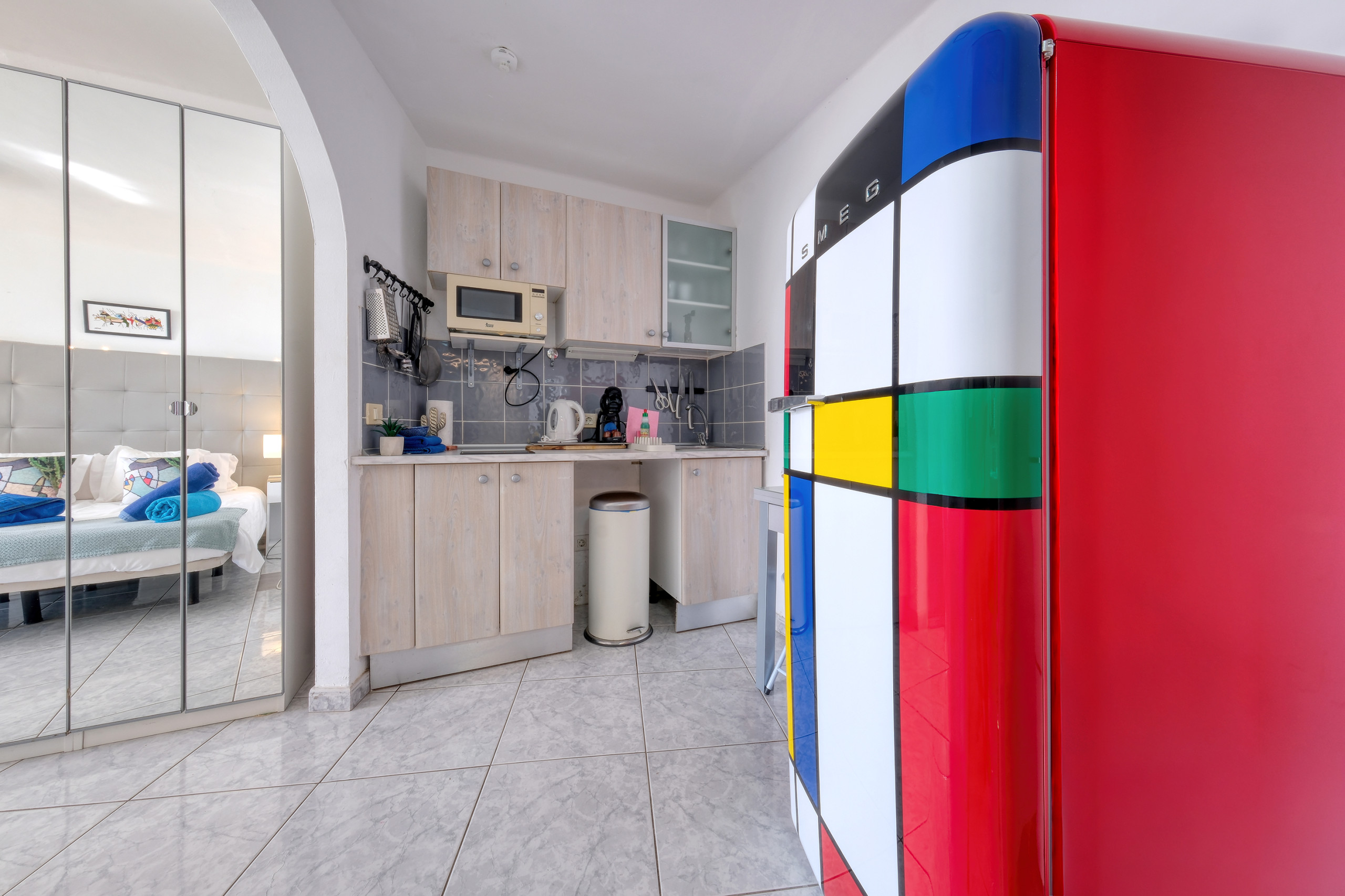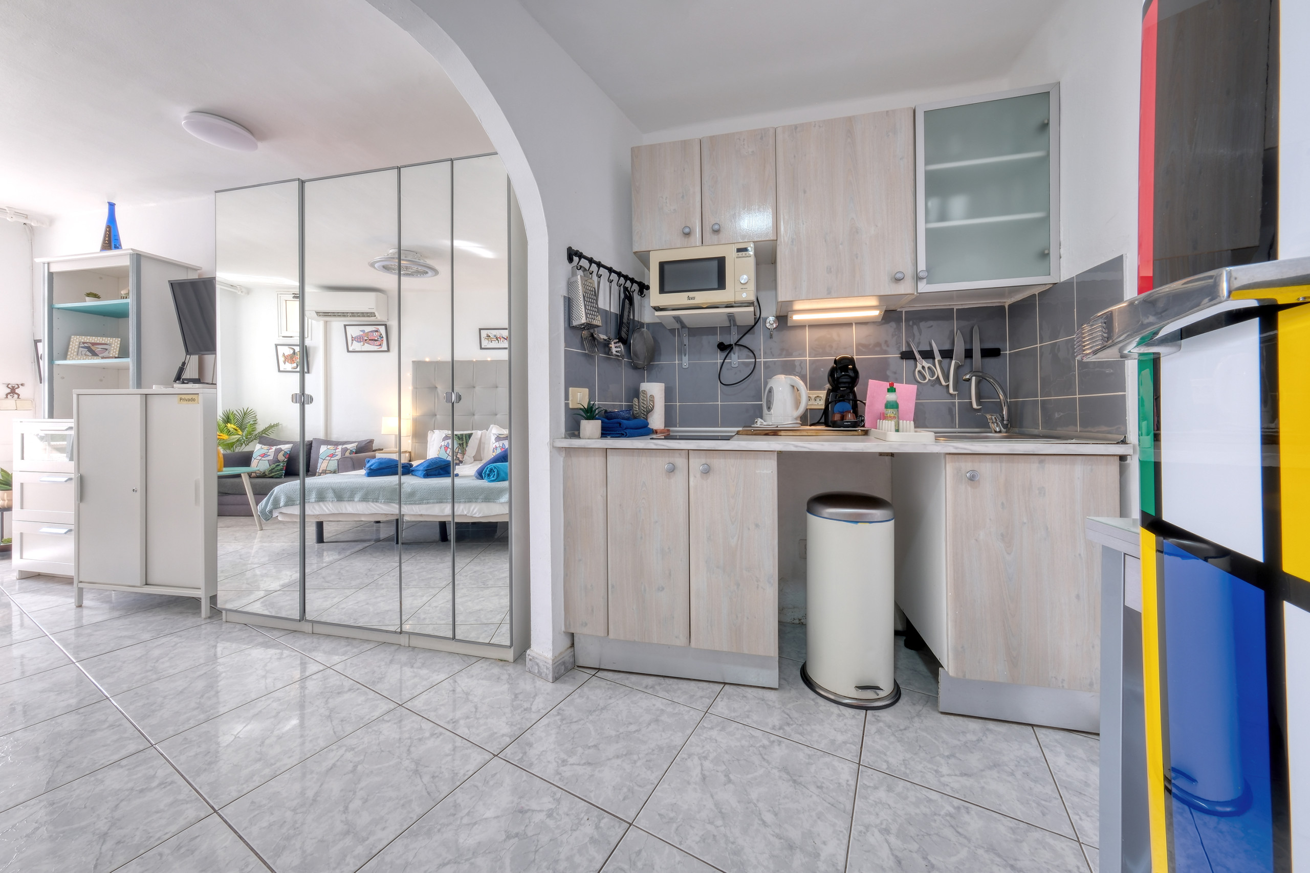 Fully equipped kitchen with ceramic hob, microwave, coffee maker, toaster, kettle, air fryer and complete utensils