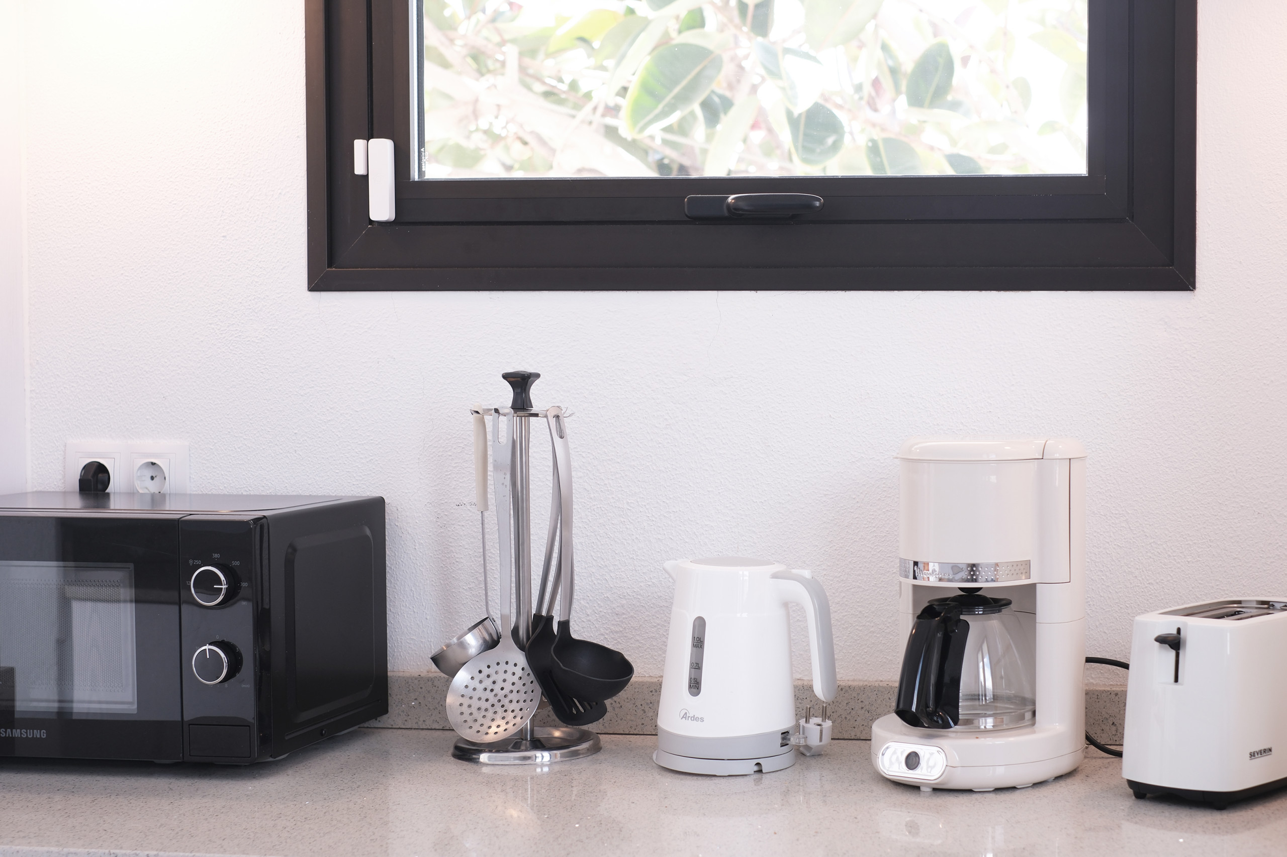 La cucina americana, moderna e completamente attrezzata, dispone di piano cottura a induzione, forno, microonde, frigorifero, congelatore, lavastoviglie, macchina da caffè, tostapane, bollitore, stoviglie complete e tutti gli utensili necessari per un soggiorno comodo e funzionale.