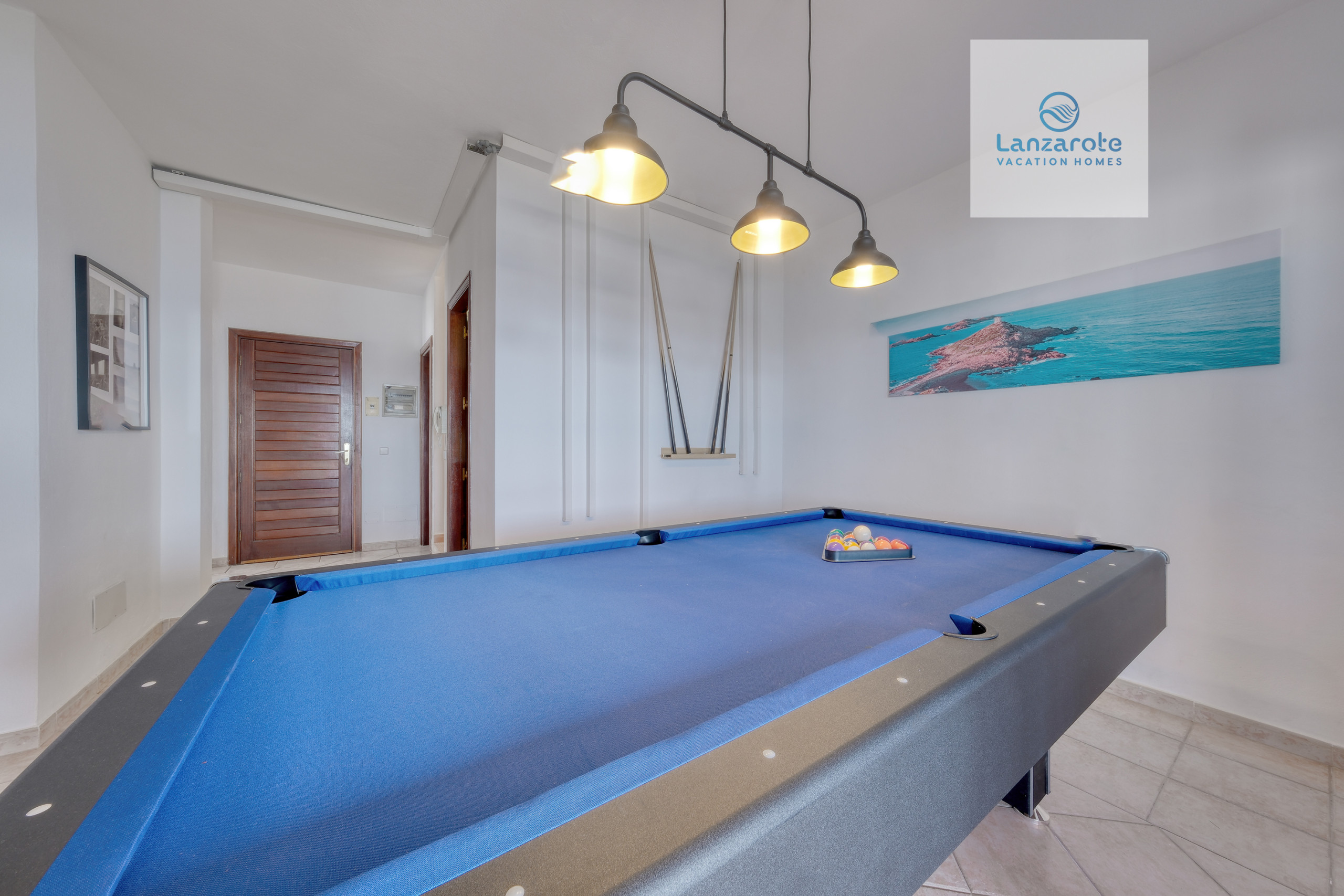 Il salone-sala da pranzo, ampio e luminoso, offre impressionanti viste sull'oceano, creando l'ambiente perfetto per rilassarsi. Inoltre, la casa dispone di un'area ricreativa con tavolo da biliardo, ideale per godersi momenti di divertimento in famiglia o con gli amici. Per maggiore comodità, l'alloggio offre wifi ad alta velocità, Smart TV nel salone con canali internazionali e televisori Smart nelle tre camere da letto.