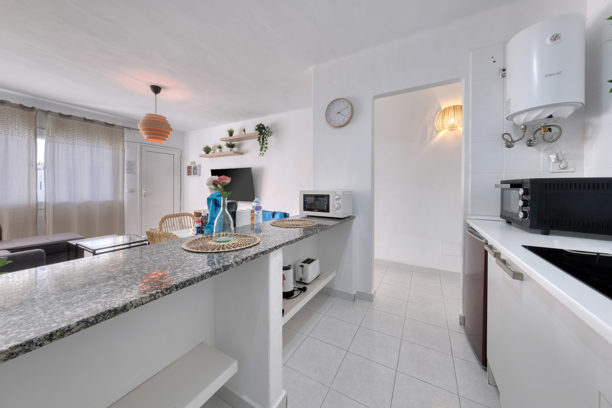 La cucina di Puerto Diamante è completamente attrezzata con elettrodomestici moderni, inclusi forno, microonde, macchina per caffè a capsule, lavatrice, frigorifero e piano cottura in vetroceramica. Il suo design pratico e i suoi ampi spazi di archiviazione consentono di cucinare con comfort. Accanto ad essa, la sala da pranzo dispone di un tavolo spazioso e sedie comode, creando un ambiente perfetto per condividere pasti e riunioni.