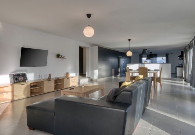 Il design a concetto aperto integra una cucina moderna completamente attrezzata —lavastoviglie, forno, microonde, macchina da caffè, tostapane, bollitore e tutti gli utensili necessari— con la sala da pranzo e un ampio soggiorno. Questo spazio si apre verso l'esterno attraverso grandi finestre, offrendo un accesso diretto alla piscina privata, circondata da lettini, perfetta per godersi il sole di Lanzarote durante tutto l'anno.