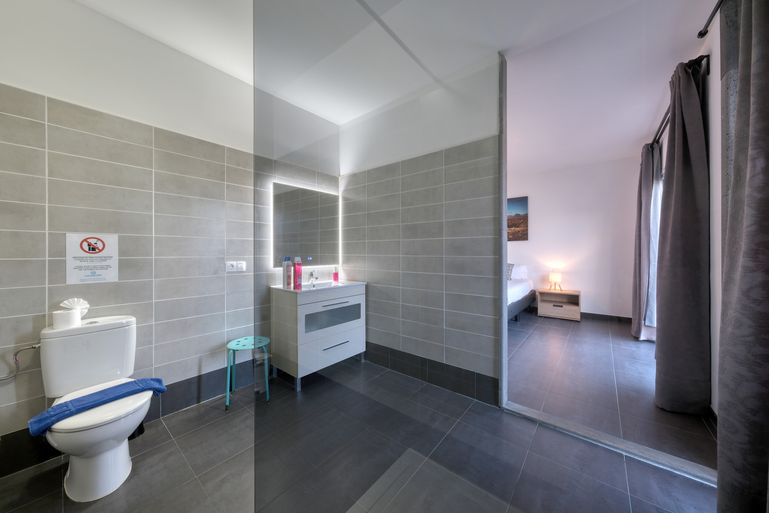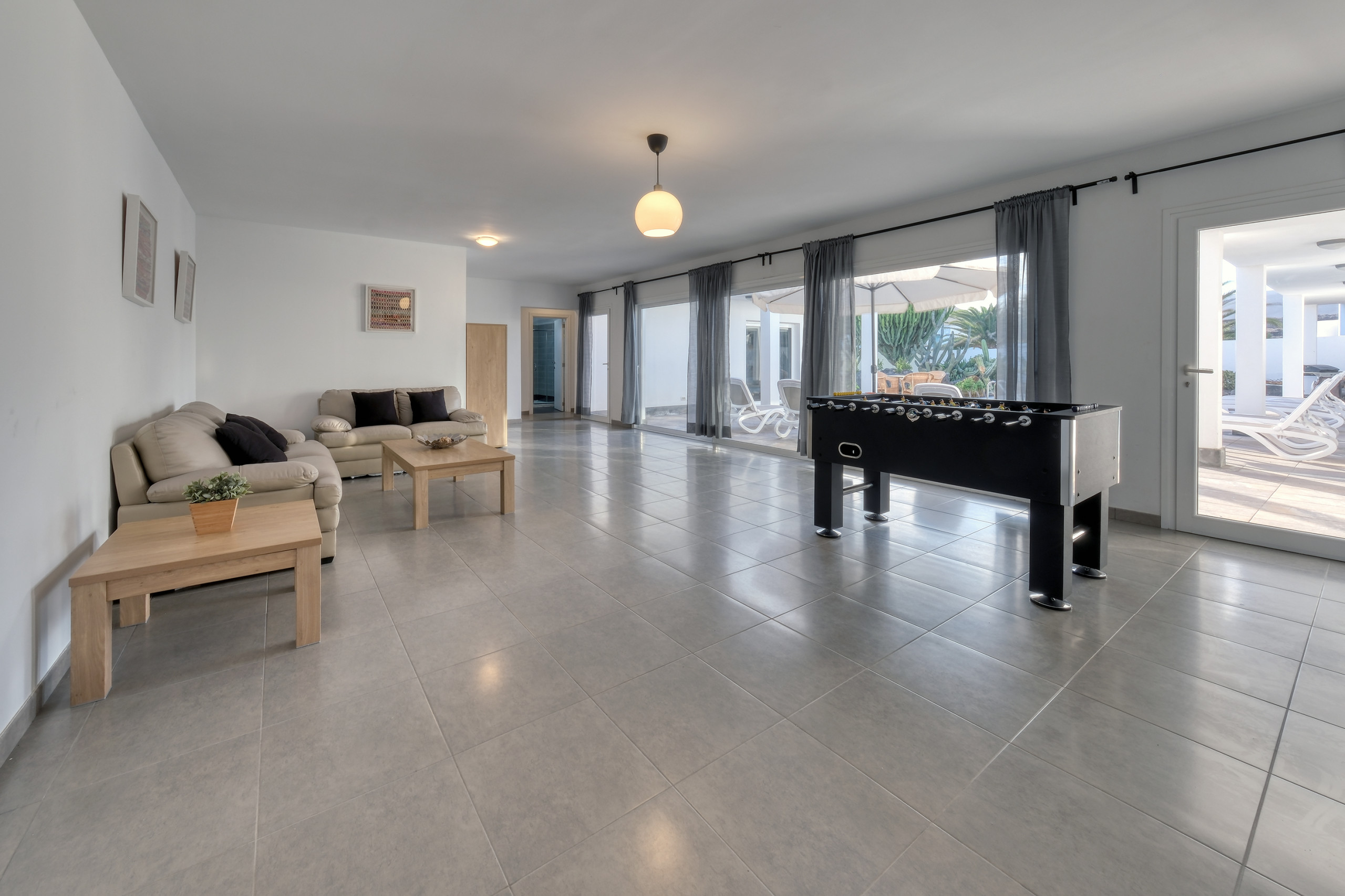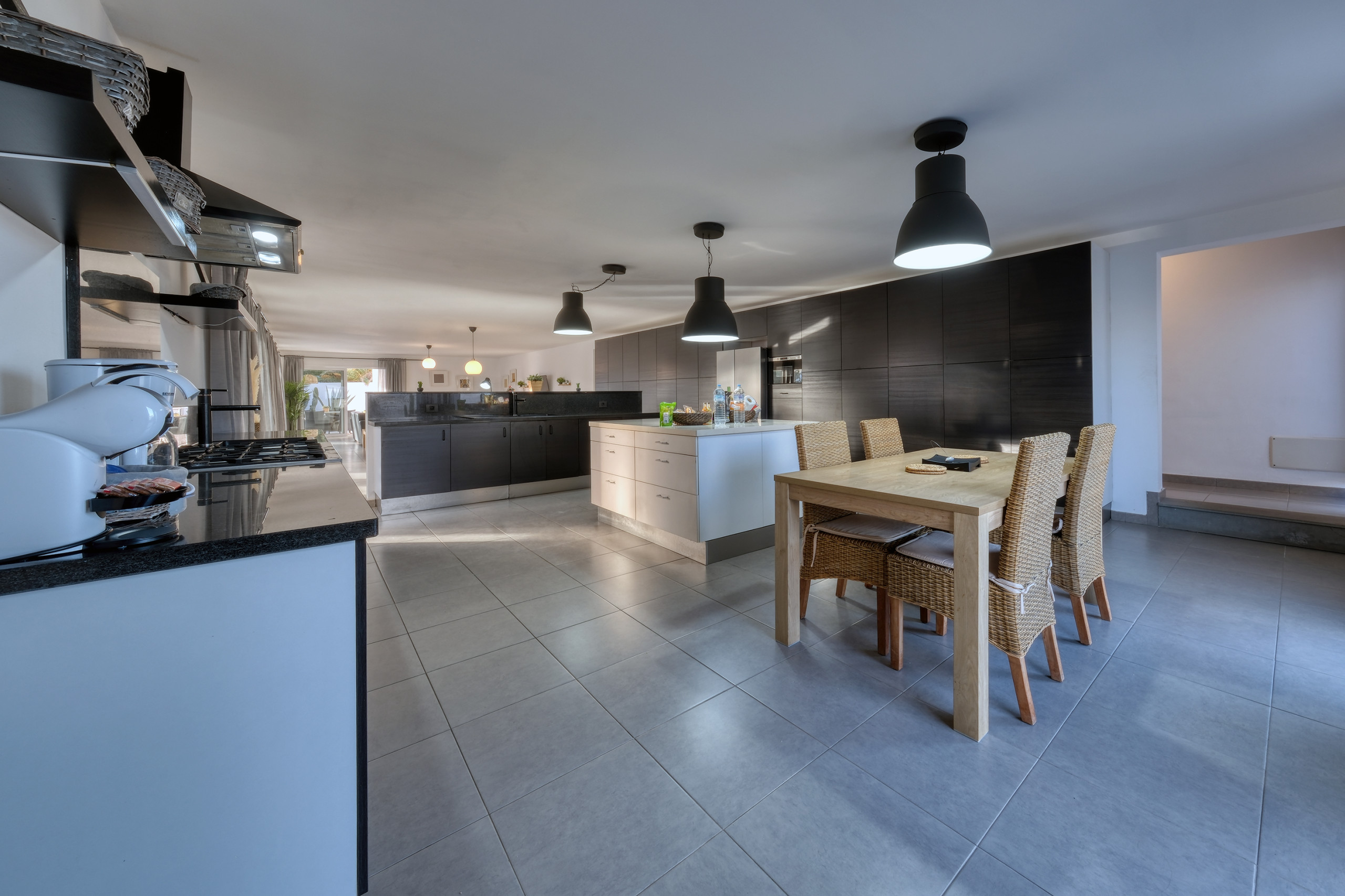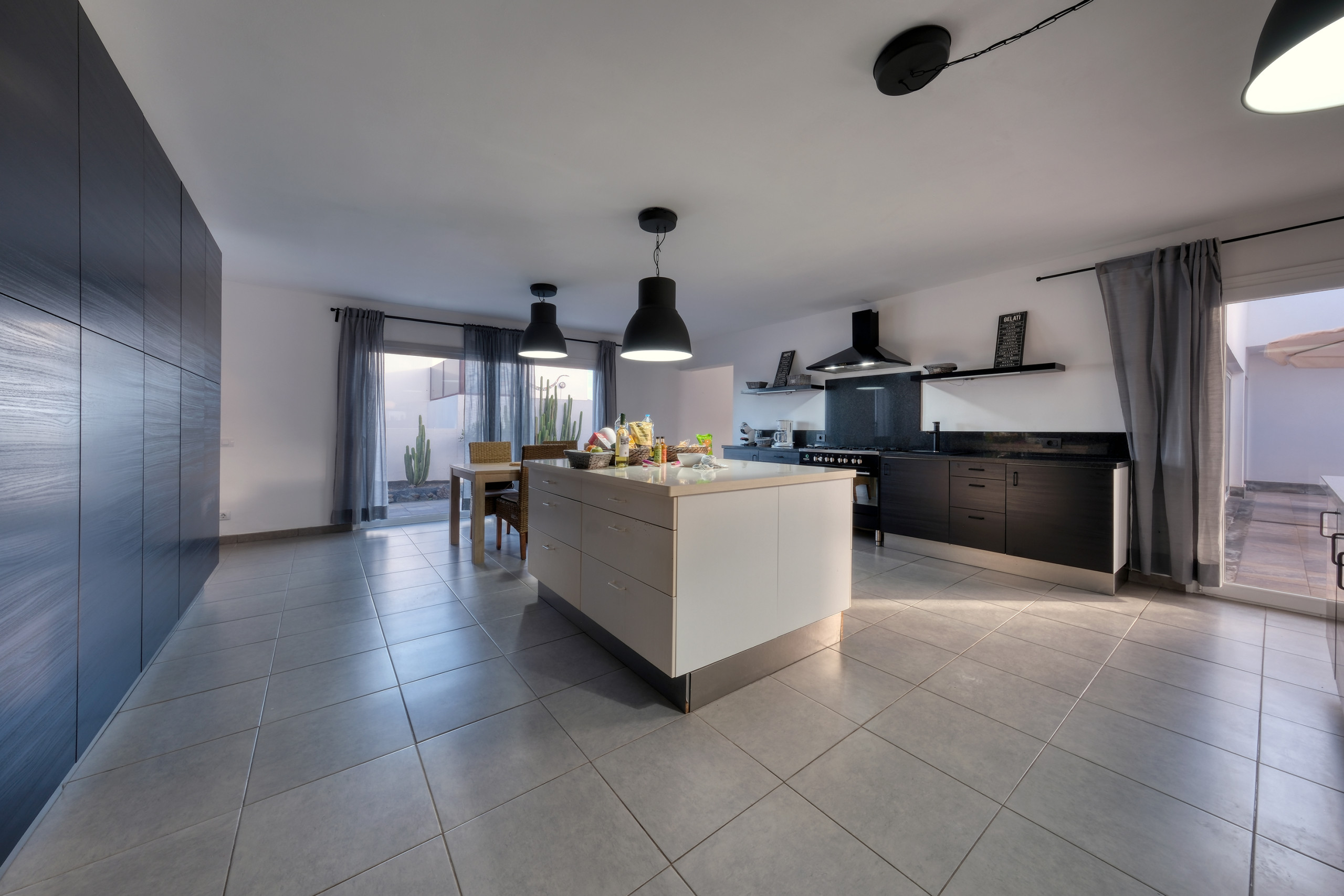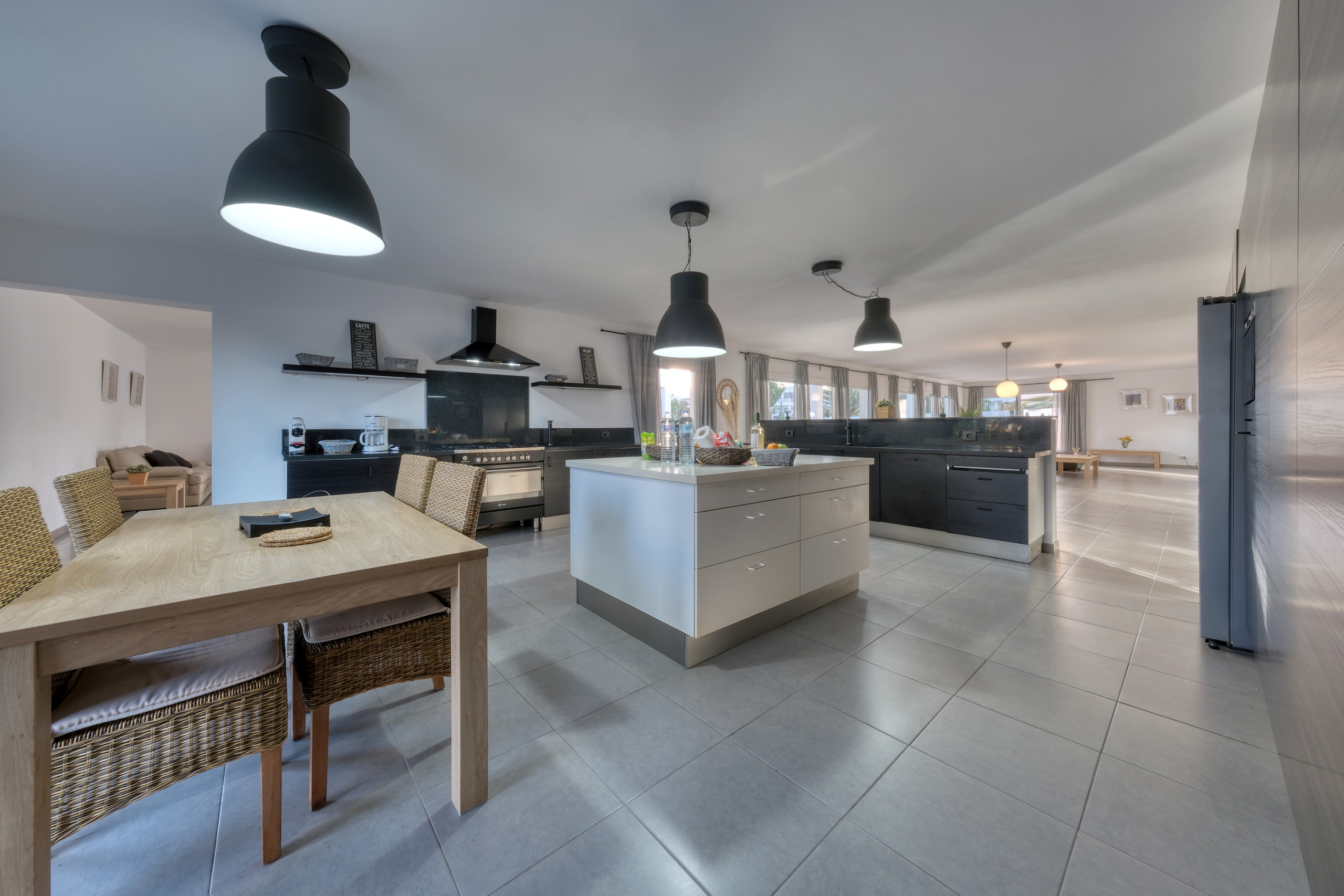 Il design a concetto aperto integra una cucina moderna completamente attrezzata —lavastoviglie, forno, microonde, macchina da caffè, tostapane, bollitore e tutti gli utensili necessari— con la sala da pranzo e un ampio soggiorno. Questo spazio si apre verso l'esterno attraverso grandi finestre, offrendo un accesso diretto alla piscina privata, circondata da lettini, perfetta per godersi il sole di Lanzarote durante tutto l'anno.