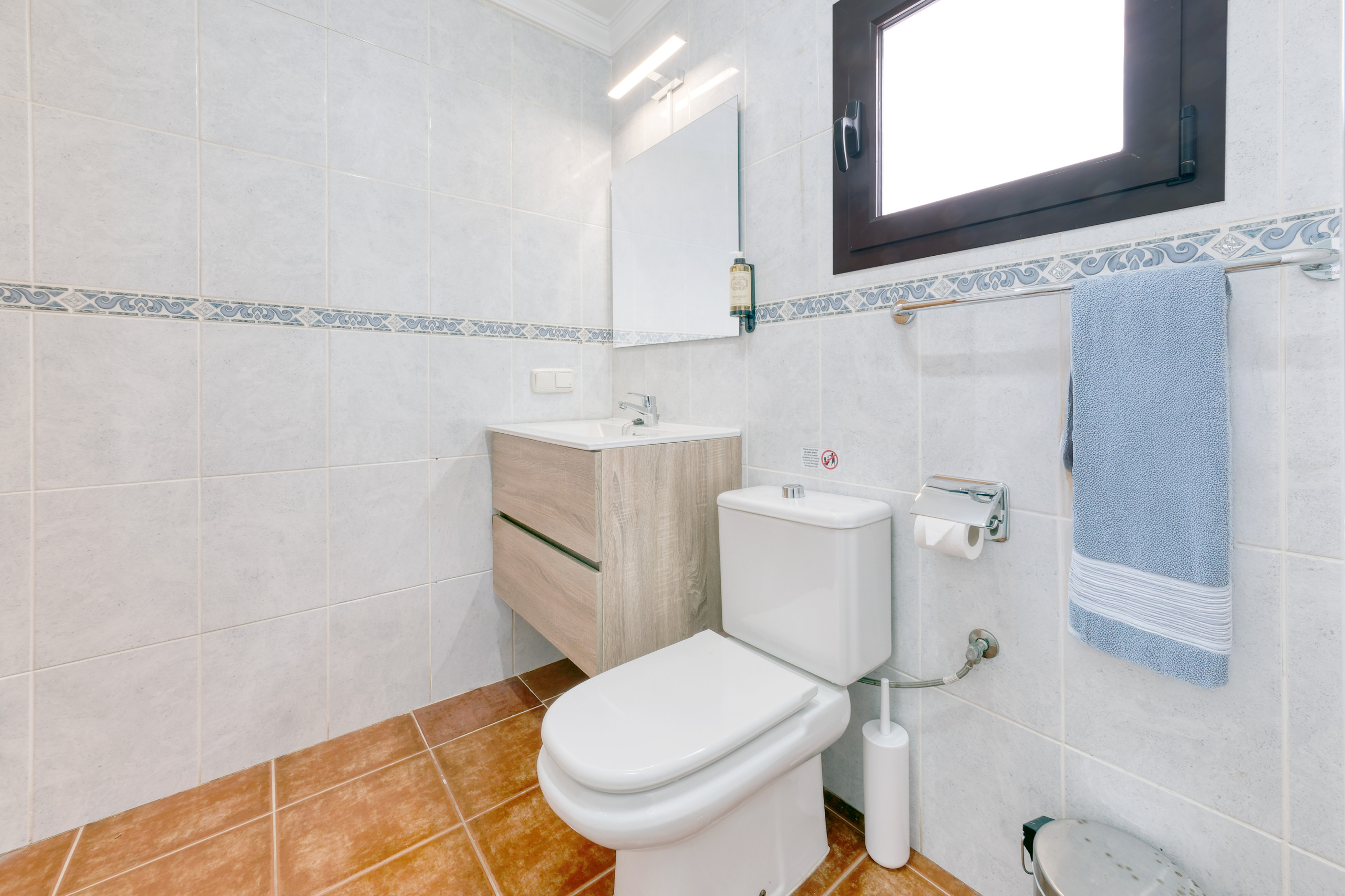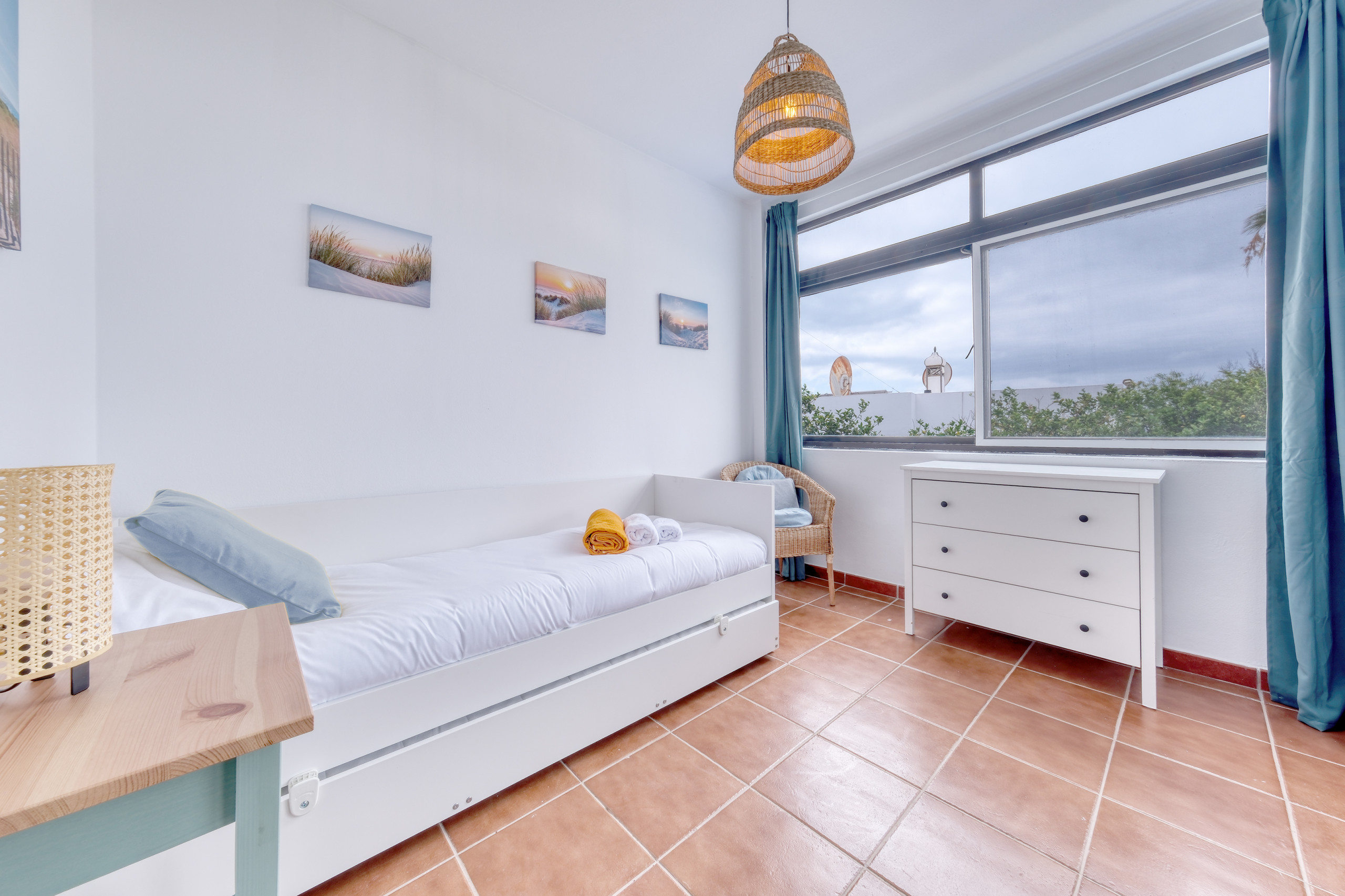 Salendo le scale, si arriverà al primo piano, dove si trovano la quarta e la quinta camera. La quarta camera è attrezzata con un letto da 90 cm, armadio, specchio e finestra con vista esterna. La quinta camera offre un letto matrimoniale, aria condizionata, scrivania e bagno in suite con ampio piatto doccia. Questa camera ha accesso a un'ampia terrazza esterna, parzialmente coperta e parzialmente aperta, ideale per prendere il sole. La terrazza è attrezzata con divani e offre una bella vista su Playa Blanca.